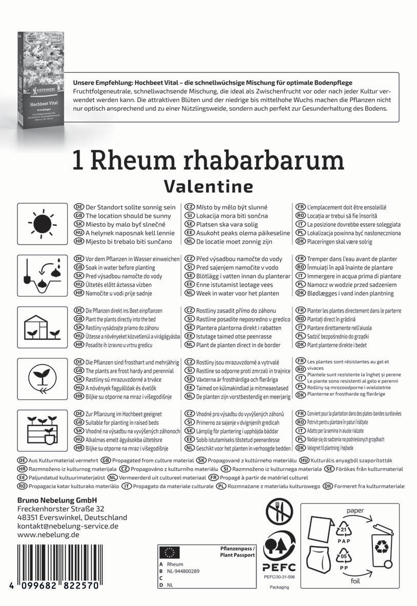 Die Rhabarbersorte `Valentine` zeichnet sich durch lange, schlanke, leuchtend rote Blattstiele mit grünem Fruchtfleisch aus. Sie sind hervorragend zum Kochen oder für den Rohverzehr geeignet. Die Sorte Valentine kann früh beerntet werden. Wichtig ist, dass bei Ernteende im Juni/ Juli noch genügend Blattmasse zur Verfügung steht, damit die Pflanze ausreichend Reservestoffe für den nächsten Sommer einlagern kann. Der ‘Valentine‘ Rhabarber erreicht eine Wuchshöhe von bis zu 90 Zentimetern. Die Blätter des ‘Valentine‘ sind kräftig grün und bilden einen attraktiven Kontrast zu den leuchtend roten Stängeln. Dieses Zusammenspiel verleiht der Pflanze ein gesundes und ansprechendes Erscheinungsbild.Kurzbezeichnung : | Rhabarber Valentine Rheum rhabarbarum |