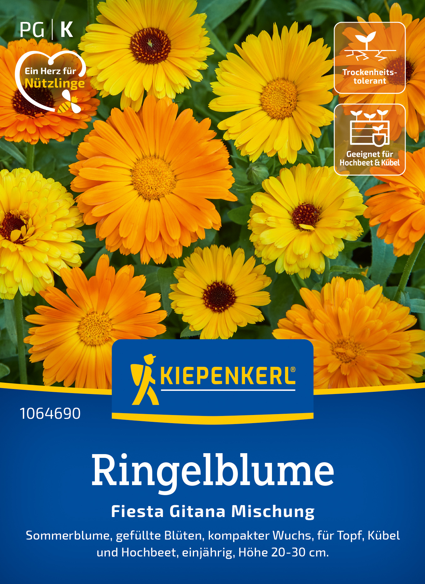Die Ringelblume 'Fiesta Gitana' überrascht mit gefüllten Blüten in strahlenden Gelb- und Orangetönen. Diese blühfreudigen, pflegeleichten Pflanzen sind ideal für den Beetvordergrund oder als farbenfrohe Akzente in Töpfen und Kübeln. Ihre essbaren Blüten machen sie zu einer wunderbaren Dekoration für jeden Salat und erfreuen sich auch bei Insekten großer Beliebtheit. Bereichern Sie Ihren Garten mit diesen unkomplizierten Pflanzen und genießen Sie die üppigen Blüten, die lebendige Farbnuancen in Ihre Grünflächen bringen. Lassen Sie Ihre Kreativität bei der Gartengestaltung freien Lauf! Bringen Sie Farbe mit der Ringelblume 'Fiesta Gitana' in Ihren Garten!| Kurzbezeichnung : | Ringelblume Fiesta Gitana Mischung |