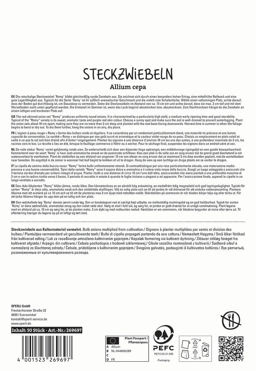 Die Sorte „Romy“ bildet gleichmäßig runde Zwiebeln mit einer festen Schale in tiefroter bis violetter Farbe und einem süßlich-aromatischen Geschmack. Diese mittelfrühreifende Zwiebel zeichnet sich durch einen sehr hohen Ertrag aus. Dank ihrer Toleranz gegenüber verschiedener Standort- und Witterungsbedingungen punktet „Romy“ mit einer hohen Widerstandsfähigkeit. Steck die Steckzwiebeln im Frühjahr in durchlässigen, nährstoffreichen Boden an einem möglichst sonnigen Standort. Ein Reihenabstand von 20–25 cm und ein Pflanzabstand von 10–15 cm fördern eine optimale Entwicklung. Regelmäßige Wassergaben ohne Staunässe unterstützen das Wachstum und die Zwiebelbildung. Mit „Romy“ bekommst Du eine ertragreiche und geschmackvolle Zwiebel, die sich ideal für Gemüse-Neulinge eignet.| Kurzbezeichnung : | Rote Steckzwiebel Romy |