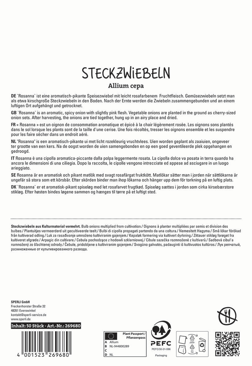 'Rosanna' ist eine Steckzwiebel, die aufgrund ihres leicht rosa gefärbten Fruchtfleisches, vor allem im rohen Zustand, optisch besonders reizvoll ist. Ihr Geschmack ist süß und fruchtig, ihr Aroma mild. Die Zwiebeln können von März bis Mai in ein vollsonniges Beet gepflanzt werden.