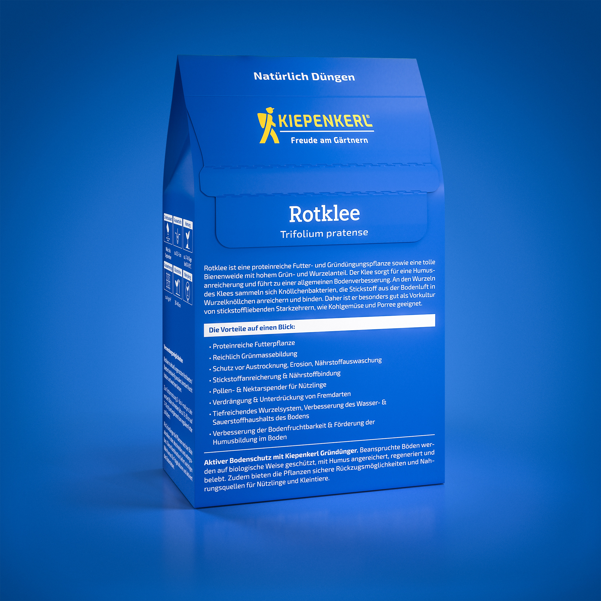Rotklee ist eine ideale Futter- und Gründüngungspflanze, die durch ihren hohen Proteingehalt überzeugt und gleichzeitig eine hervorragende Bienenweide darstellt. Mit ihrem beeindruckenden Anteil an Grün- und Wurzelmasse trägt Rotklee wesentlich zur Humusanreicherung und allgemeinen Bodenverbesserung bei. An den Wurzeln des Rotklees sammeln sich Knöllchenbakterien, die den Stickstoff aus der Bodenluft in Wurzelknöllchen anreichern und binden. Diese Eigenschaft macht Rotklee besonders geeignet als Vorkultur für stickstoffliebende Starkzehrer wie Kohlgemüse und Porree.