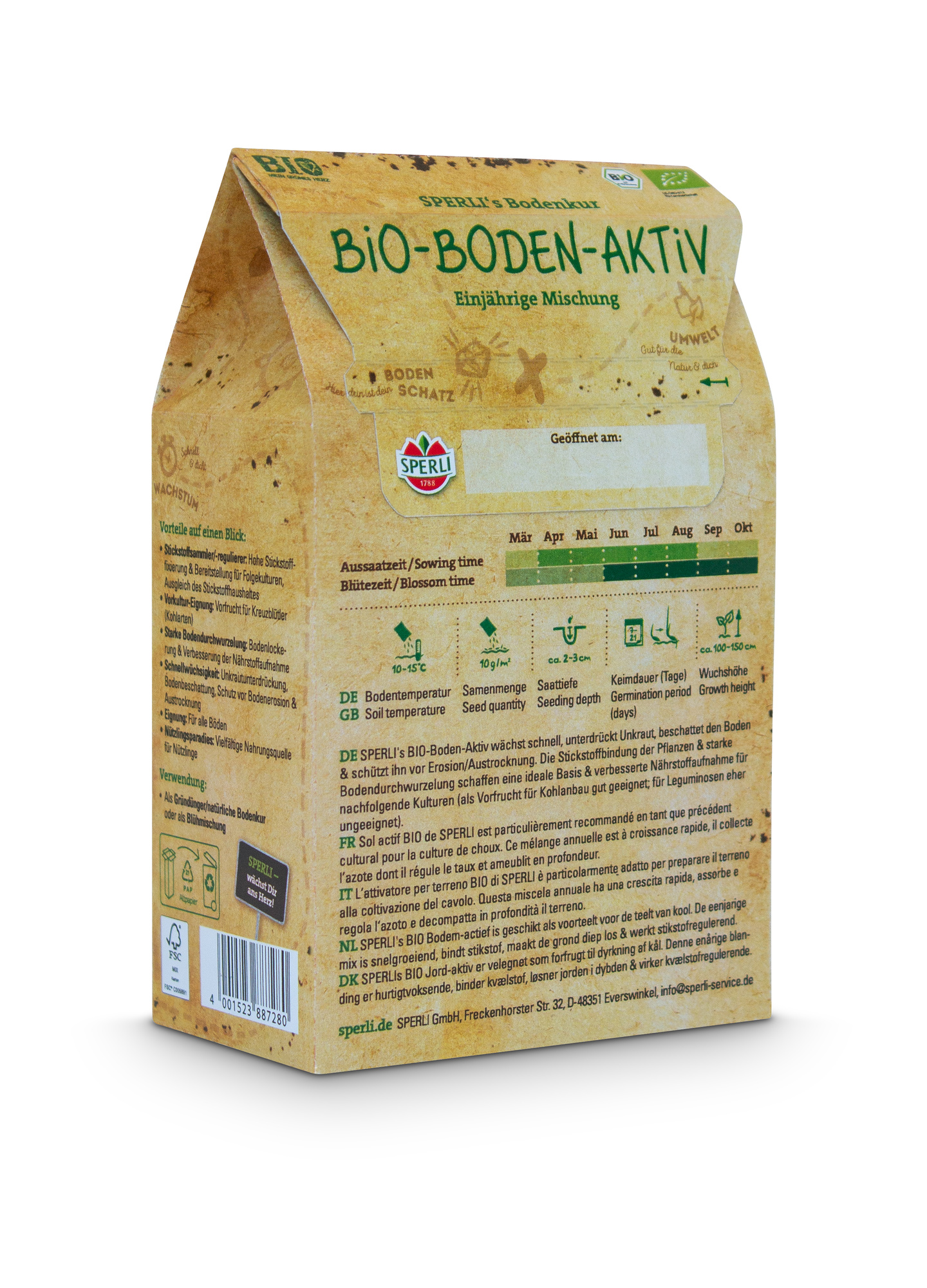Die Sperli BIO-Gründüngermischung "Bodenkur BIO-Boden-Aktiv" ist besonders als Vorfrucht für den Kohlanbau geeignet. Die einjährige Mischung ist schnellwachsend, unkrautunterdrückend, beschattet den Boden und schützt ihn vor Erosion sowie Austrocknung. Die Stickstoffbindung und starke Durchwurzelung des Bodens schaffen eine ideale Basis und verbesserte Nährstoffaufnahme für nachfolgende Kulturen. Als Vorfrucht für Leguminosen ist diese Mischung eher nicht geeignet, bei überdüngten Böden kann sie als Stickstoffregulierer eingesetzt werden. "Bodenkur BIO-Boden-Aktiv" findet als Gründünger oder Blühmischung Verwendung.Kurzbezeichnung : | SPERLI's Bodenkur BIO-Boden-Aktiv, 0,5 kg |
