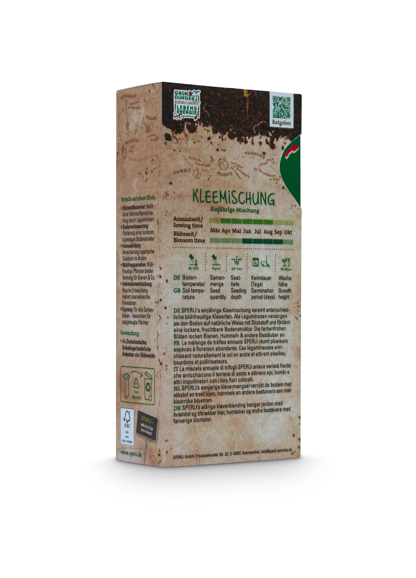 Die Sperli Gründüngermischung "Bodenkur Kleemischung" ist eine einjährige Mischung aus verschiedenen blühfreudigen Kleearten. Als Leguminosen leben die Pflanzen in Symbiose mit Knöllchenbakterien und sind dadurch in der Lage, Stickstoff aus der Bodenluft zu binden. Die Mischung eignet sich hervorragend zur natürlichen Nährstoffanreicherung und zur Förderung einer lockeren, fruchtbaren Bodenstruktur. Ihre bunten Blüten machen sie zudem zu einer attraktiven Nützlingsweide für Bienen, Hummeln und andere Bestäuber. Ideal als ökologische Gründüngung und strukturverbessernde Zwischenkultur.Kurzbezeichnung : | SPERLI's Bodenkur Kleemmischung, 0,23 kg |