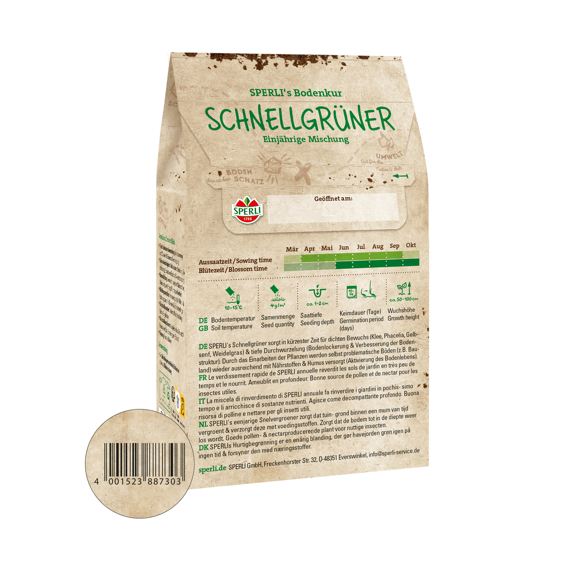 Die Sperli Gründüngermischung "Bodenkur Schnellgrüner" begrünt Gartenböden in kürzester Zeit. Der dichte, einjährige Pflanzenbestand aus Klee, Phacelia, Gelbsenf und Weidelgras beschattet den Boden und schützt ihn vor Erosion. Das tiefreichende Wurzelsystem trägt zur Bodenlockerung und damit zur Verbesserung der Bodenstruktur bei. Durch die Einarbeitung des Schnellgrüners in den Boden werden selbst problematische Böden wieder ausreichend mit Nährstoffen sowie Humus versorgt und das Bodenleben wieder aktiviert. Der nährstoffreiche Aufwuchs eignet sich auch optimal zur Kompostierung.| Kurzbezeichnung : | SPERLI's Bodenkur Schnellgrüner 0,45 kg |