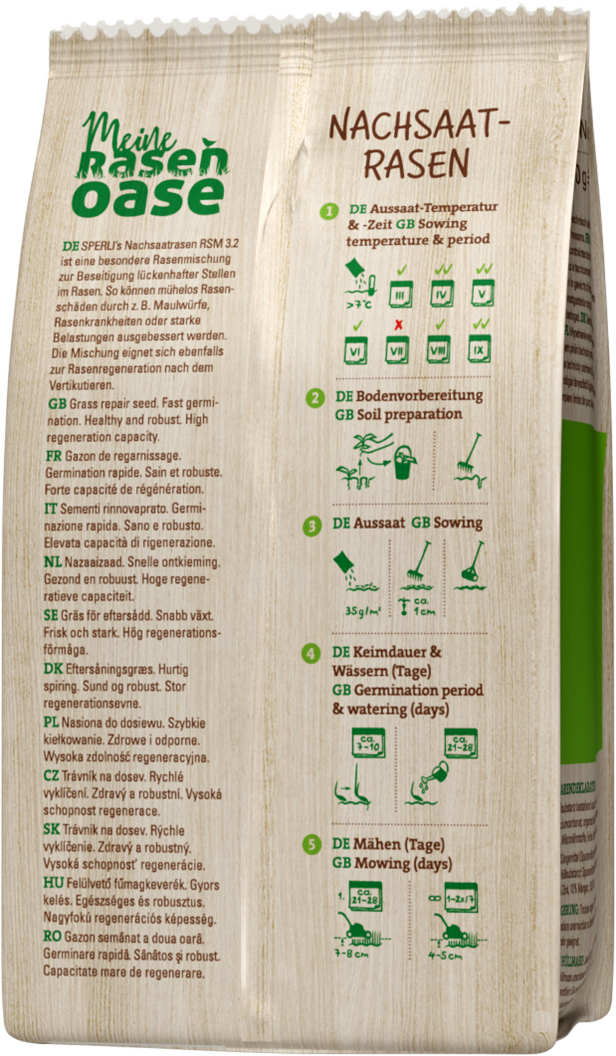 SPERLI's Nachsaatrasen, Dein verlässlicher Partner für einen makellosen Grünteppich! Diese spezielle Rasenmischung ist perfekt dazu geeignet, lückenhafte Stellen im Rasen mühelos auszubessern und ihm zu neuem Leben zu verhelfen. Egal ob durch Maulwürfe, Krankheiten oder starke Belastungen - Rasenschäden werden zuverlässig repariert, und auch nach dem Vertikutieren sorgt die Mischung für eine kraftvolle Regeneration. Die robusten und regenerationsstarken Gräser garantieren ein kräftiges, sattes Grün, das allen Anforderungen gewachsen ist.