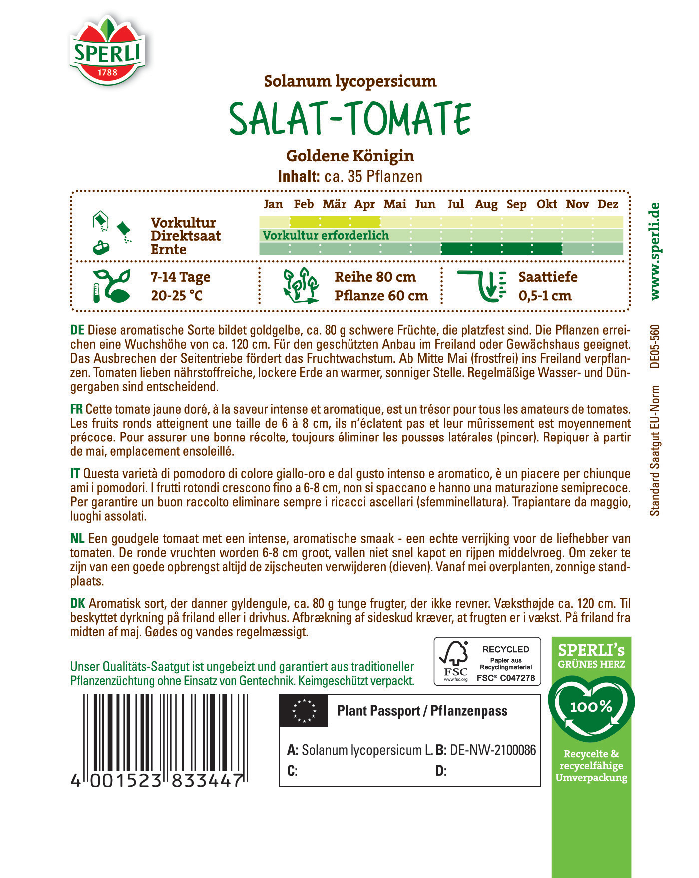 'Goldene Königin' ist eine samenfeste Sorte, die sich im Freiland an einem sonnigen und windgeschützten Platz wohlfühlt, aber auch für den Gewächshausanbau geeignet ist. Wenn Du die Pflanzen immer ausreichend Wasser versorgst, ab und an düngst und stets die Seitentriebe ausbrichst, wirst Du besonders hohe Erträge erzielen.