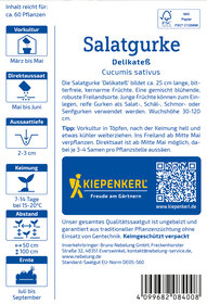 Die Salatgurke 'Delikateß' begeistert mit ihren etwa 25 cm langen, bitterfreien und kernarmen Früchten, die eine ideale Ergänzung für jede Küche darstellen. Diese robuste Freilandsorte eignet sich nicht nur perfekt für frische Salate, sondern auch für eine Vielzahl kulinarischer Anwendungen. Ob Sie die jungen Früchte zum Einlegen verwenden oder die reifen Gurken für Schäl-, Schmor- und Senfgurken zubereiten – mit 'Delikateß' haben Sie immer eine leckere Auswahl. Ihr frisch-knackiger Geschmack macht sie zur beliebten Wahl unter Gartenfreunden und verspricht Genuss in vollen Zügen. Nutzen Sie die Vorteile der Salatgurke 'Delikateß', um gesunde und schmackhafte Gerichte zuzubereiten, die direkt aus Ihrem Garten kommen. Bringen Sie frische, leckere Zutaten auf den Tisch und genießen Sie die Sommerzeit, während Sie den unvergleichlichen Geschmack dieser besonderen Gurkenvielfalt erleben! Pflanzen Sie die Salatgurke 'Delikateß' und sorgen Sie für frischen Geschmack in Ihrer Küche!| Kurzbezeichnung : | Salatgurke Delikateß |