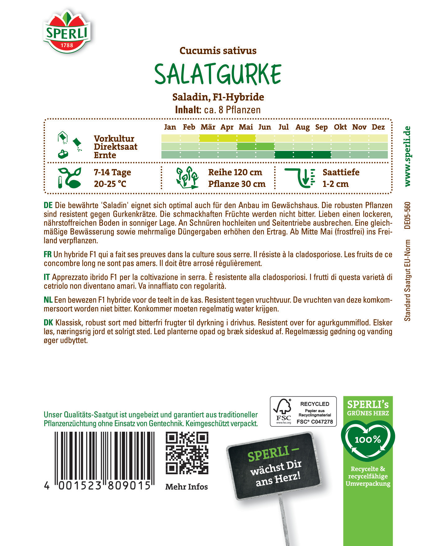 Bei der Salatgurke 'Saladin' handelt es sich um eine F1-hybride Sorte, die sich aufgrund ihres robusten Wachstums sehr bewährt hat. Sie ist für den Anbau im Gewächshaus wie geschaffen und weist eine natürliche Resistenz gegen Gurkenkrätze auf. Die Aussaat kannst Du für den März oder April einplanen.Bis zur ersten Ernte ab Juni solltest Du Deine Gurkenpflanzen mit Rankhilfen im Wachstum unterstützen, Seitentriebe aus den Blattachseln entfernen und regelmäßig gießen. Sie danken es Dir mit ca. 36 cm langen Früchten, die frei von Bitterstoffen und deshalb umso schmackhafter sind!| Kurzbezeichnung : | Salatgurke Saladin, F1 |