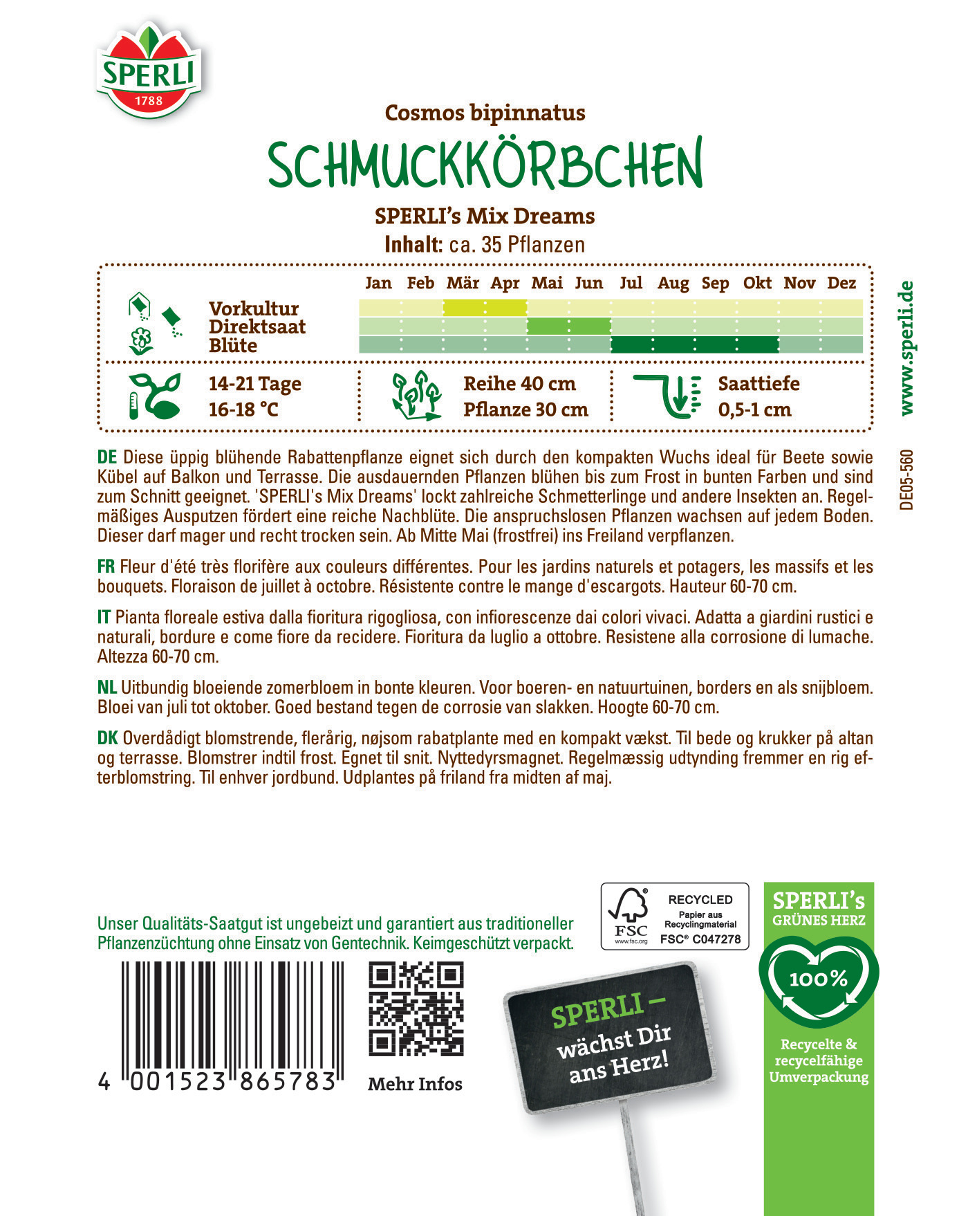 SPERLI’s Mix Dreams enthält Sommerblumen in verscheidenen weiß und rosaroten Tönen. Sie zeichnet sich durch einen gut verzweigten, kompakten Wuchs und eine lange Blühperiode aus. Bestens geeignet als Hintergrundpflanze für Beete und Rabatten oder als üppige Kübelpflanzen. Ideal auch zum Schnitt für einen sommerlichen Blütenstrauß. Verblühtes regelmäßig entfernen, das fördert die Blütenneubildung.| Kurzbezeichnung : | Schmuckkörbchen SPERLI's Mix Dreams |