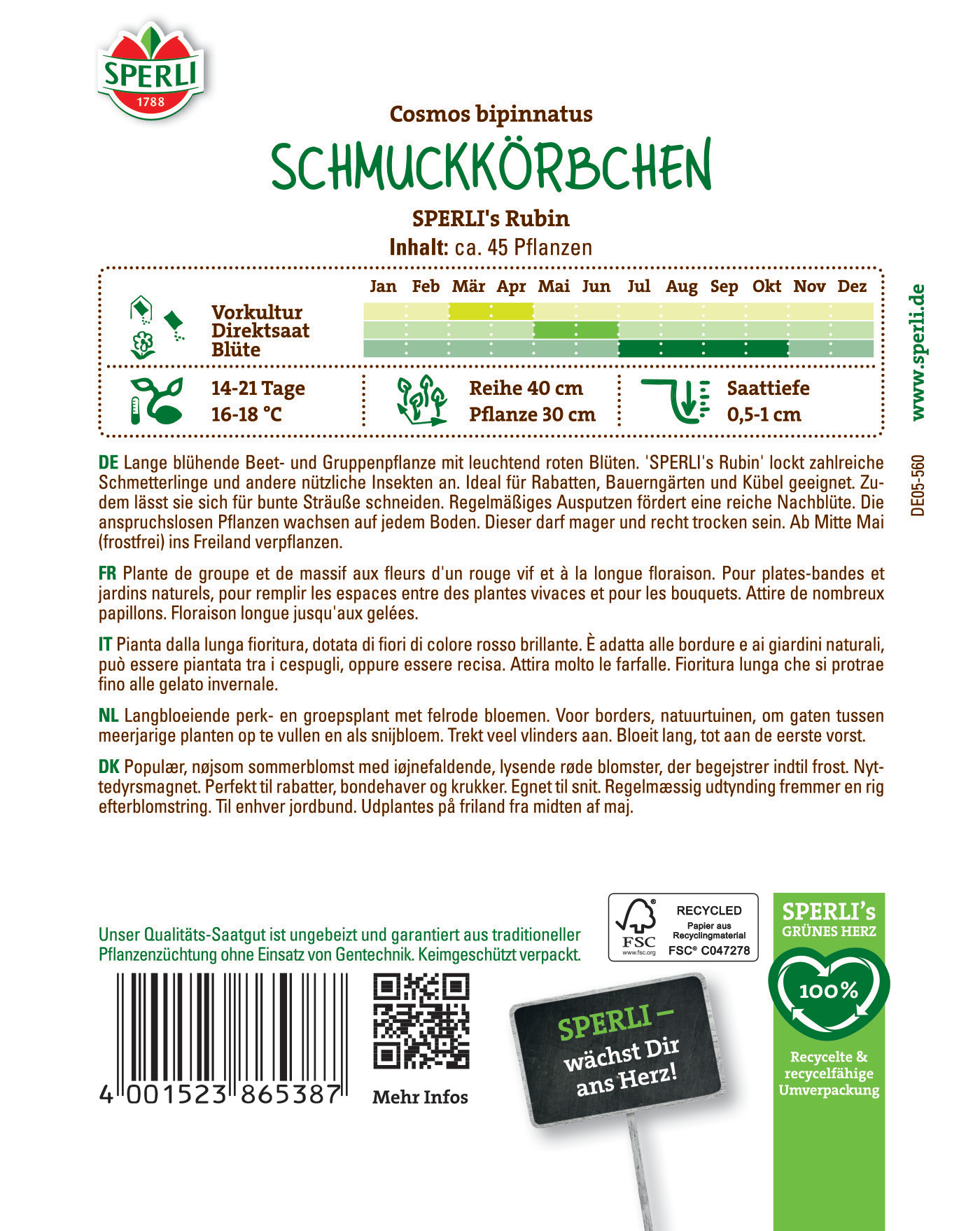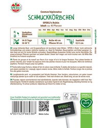 SPERLI's Rubin ist eine einjährige, starkwüchsige, großblumige Pflanze mit tiefdunklen roten Blüten und feingefiedertem Laub. Bestens geeignet als Hintergrundpflanze für Beete und Rabatten. Ideal auch zum Schnitt für einen sommerlichen Blütenstrauß. Höhe: bis zu 120 cm.| Kurzbezeichnung : | Schmuckkörbchen SPERLI's Rubin |