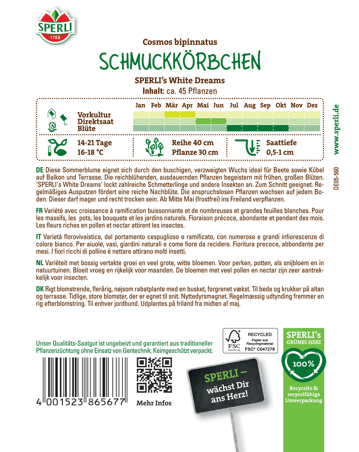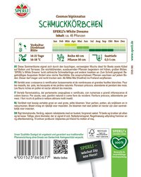 Die Sorte White Dreams weiß zeichnet sich durch einen gut verzweigten, kompakten Wuchs und eine lange Blühperiode aus. Bestens geeignet als Hintergrundpflanze für Beete und Rabatten oder als üppige Kübelpflanze. Ideal auch zum Schnitt für einen sommerlichen Blütenstrauß. Verblühtes sollte regelmäßig entfernt werden, das fördert die Blütenneubildung.| Kurzbezeichnung : | Schmuckkörbchen SPERLI's White Dreams |