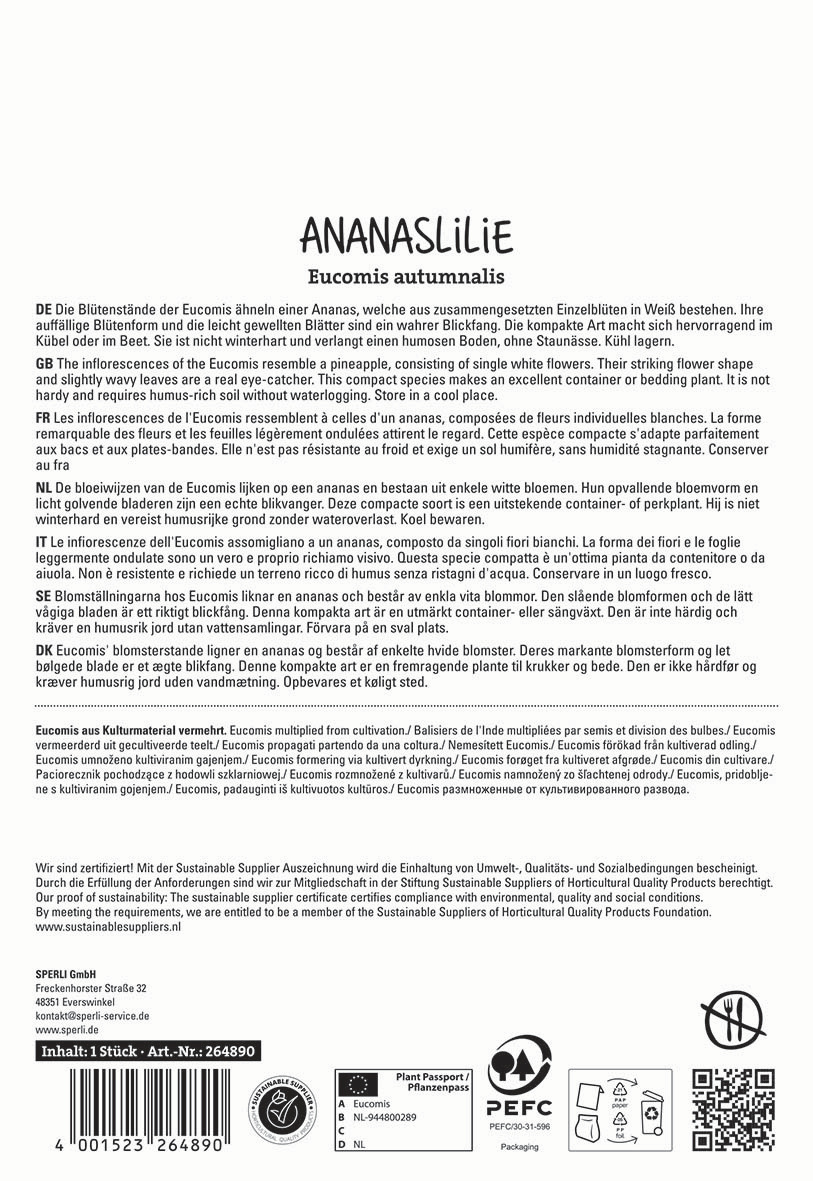 Für die perfekte Pflege: Die Eucomis autumnalis liebt die Sonne und bevorzugt gut durchlässige, humose Erde. Sie ist etwas durstig – also denke daran, sie in den Sommermonaten regelmäßig zu gießen, vor allem in der Wachstumsphase. Achte dabei auf einen lockeren Boden mit Materialien wie Lava oder Bims, damit sich keine Staunässe bildet. Ein bisschen Dünger ab und zu – und schon steht einer üppigen Blüte nichts mehr im Weg!