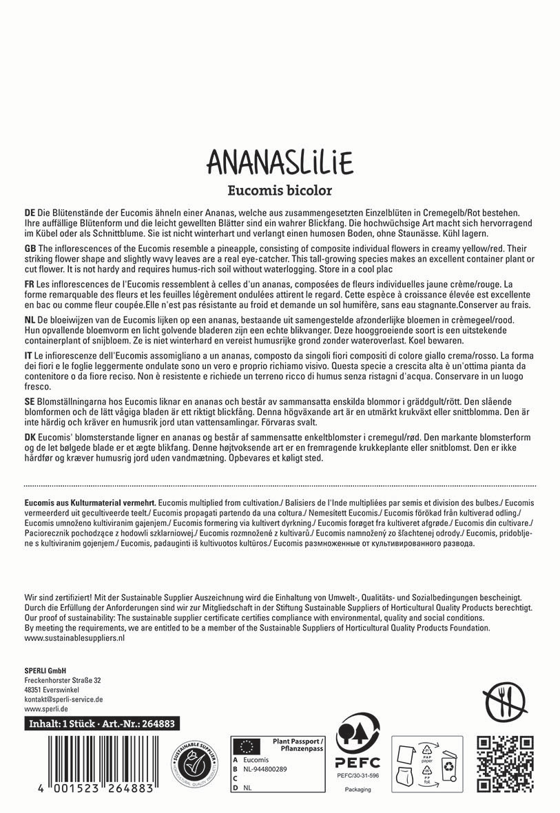 Die Ananaslilie liebt sonnige, warme und geschützte Standorte. Pflanze sie in gut durchlässigen Boden, um Staunässe zu vermeiden – am besten mit einem humosen Substrat gemischt mit Lava oder Bims. In der Wachstumszeit freut sie sich über regelmäßiges Gießen. Wenn du ihr einen Vorsprung geben willst, kannst du die Zwiebel schon im Haus vorziehen und nach den letzten Frösten Mitte Mai nach draußen setzen.