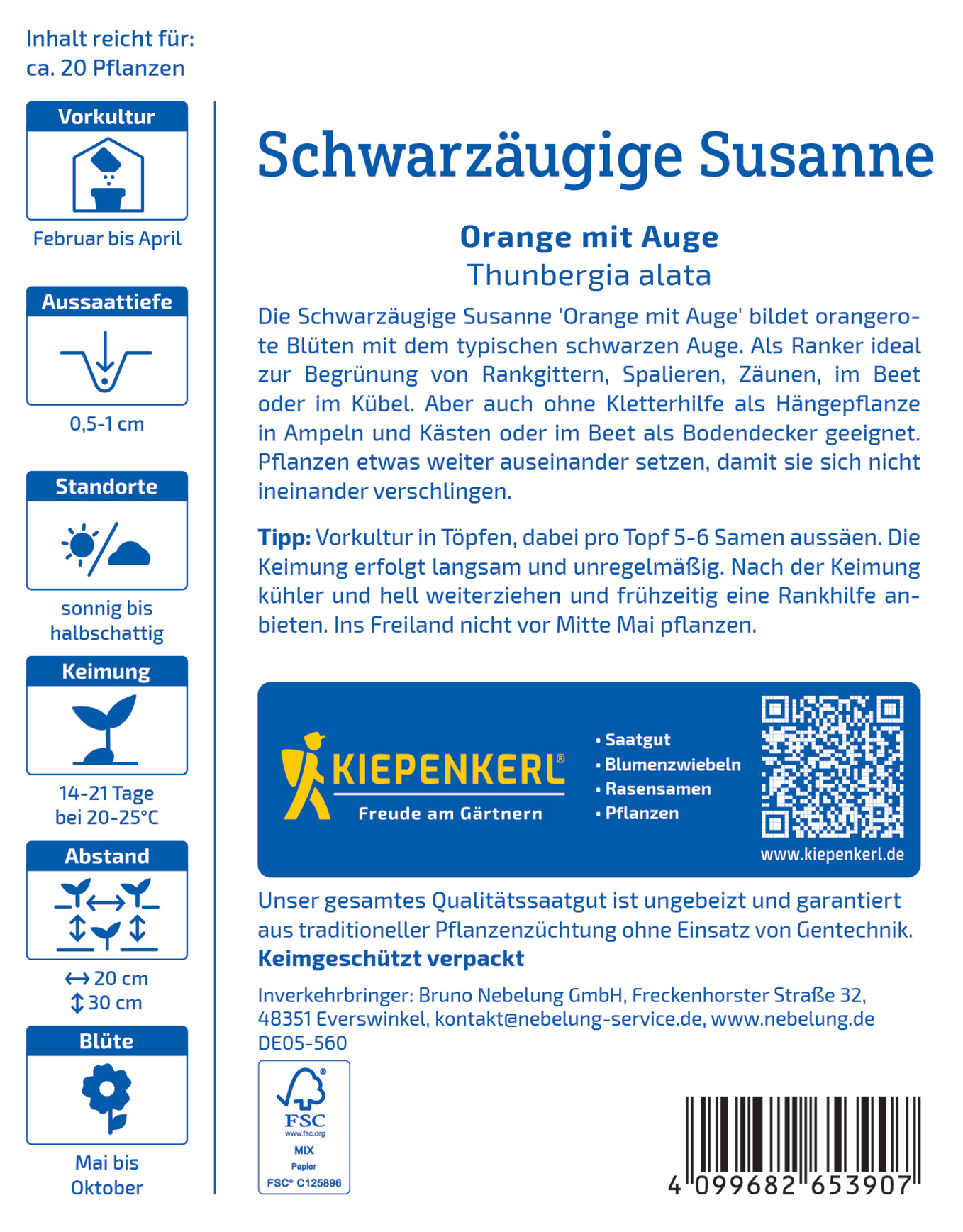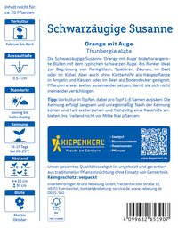 Die Schwarzäugige Susanne 'Orange mit Auge' begeistert mit leuchtend orangeroten Blüten und einem markanten dunklen Auge. Diese einjährige Pflanze ist perfekt sowohl als Kletterpflanze für Rankgitter als auch als Hängepflanze in Ampeln geeignet. Sie bringt lebhafte Farben in Ihre Garten- und Terrassengestaltung und bringt Freude in jedes Garten-Setup. Die unkomplizierte Pflege erlaubt es Ihnen, entspannt zu genießen und die Schönheit der Natur zu schätzen. Verleihen Sie Ihrem Außenbereich mit dieser attraktiven Pflanze eine herausragende Note! Bringen Sie mit der Schwarzäugigen Susanne 'Orange mit Auge' Farbe in Ihre Grünflächen!| Kurzbezeichnung : | Schwarzäugige Susanne Orange mit Auge |