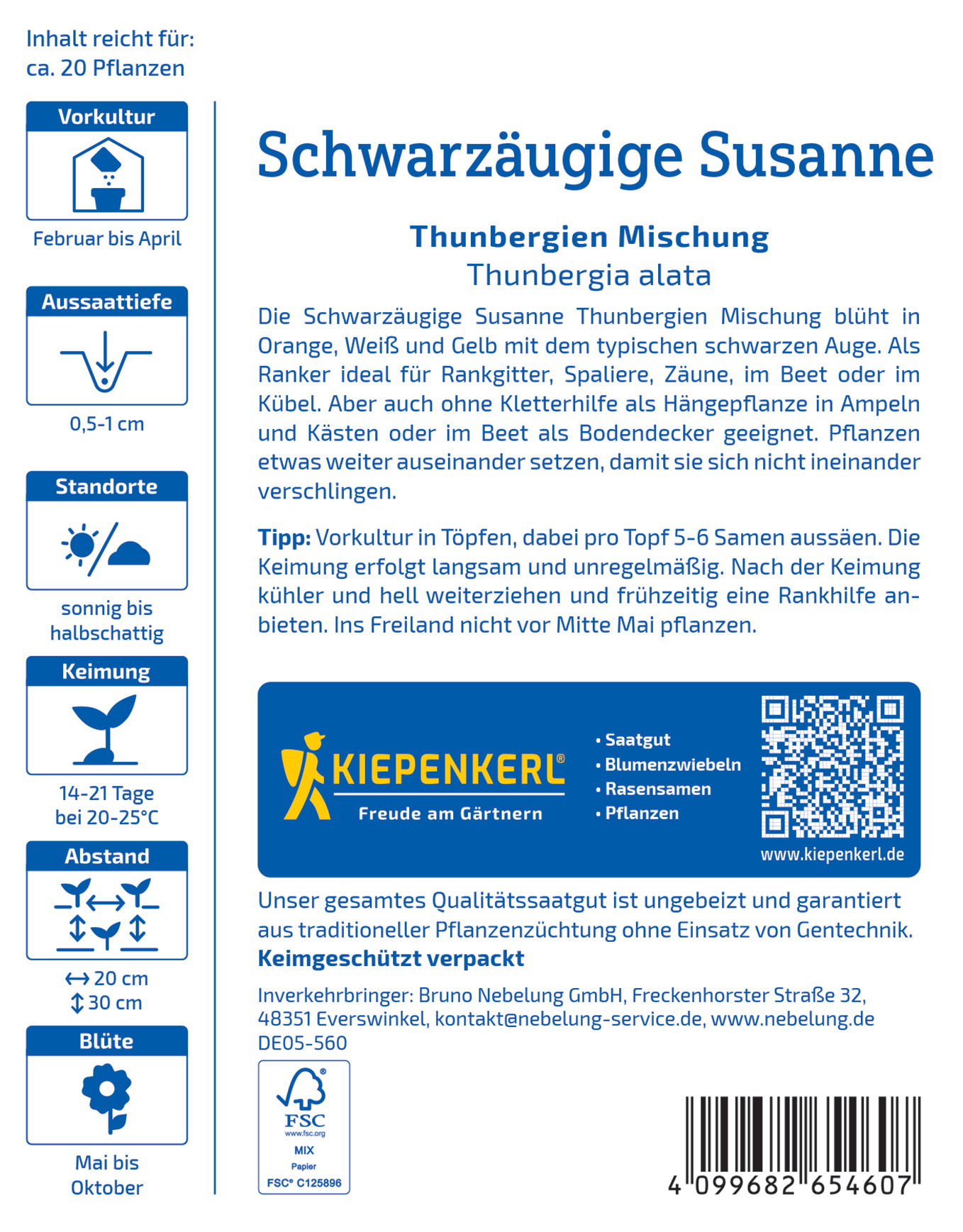 Die Schwarzäugige Susanne 'Thunbergien Mischung' bietet eine faszinierende Kombination leuchtender Blütenfarben, die in jedem Garten für einen Hingucker sorgen. Diese kletternde Pflanze eignet sich hervorragend für Rankgitter oder als farbenfrohen Bodendecker. Sie begeistert mit ihrer Blühfreude und zieht ebenso zahlreiche Insekten an, die zur Biodiversität in Ihrem Garten beitragen. Die leichte Pflege und Anpassungsfähigkeit machen sie zur idealen Wahl für Gartenliebhaber aller Erfahrungslevel. Verwandeln Sie Ihren Gitarren in ein blühendes Paradies mit dieser farbenfrohen Mischung! Verleihen Sie Ihrem Garten mit der Schwarzäugigen Susanne 'Thunbergien Mischung' Farbe und Leben!| Kurzbezeichnung : | Schwarzäugige Susanne Thunbergien Mischung |