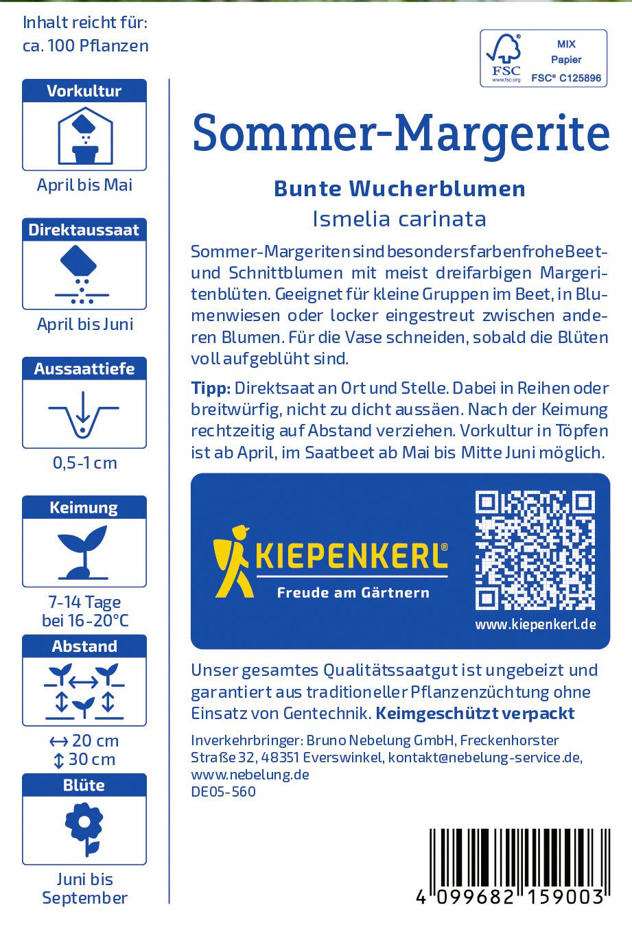 Die Sommer-Margeriten verzaubern mit ihren großen, leuchtenden Blüten in knalligem Gelb, Pink und Weiß! Diese einjährigen Pflanzen erreichen eine Höhe von 80–90 cm und sind perfekt geeignet für Gruppenbepflanzungen oder als Schnittblumen, die jedem Raum einen Hauch von Frische verleihen. Schneiden Sie die Blüten ab, sobald sie in voller Blüte stehen, um ihre lebendige Frische ins Haus zu bringen und eine fröhliche Atmosphäre zu schaffen. Gestalten Sie Ihren Garten mit Sommer-Margeriten und genießen Sie den strahlenden Look, den sie in jedes Beet bringen! Lassen Sie sich von der Farbenfreude und Lebensfreude dieser Pflanzen inspirieren und verwandeln Sie Ihren Außenbereich in ein blühendes Paradies, das jede Blicke auf sich zieht. Tauchen Sie ein in die Welt der Sommer-Margeriten und erleben Sie die Freude, die bunte Blütenpracht in Ihr Leben bringt! Bringen Sie die Sommer-Margeriten in Ihr Gartenkonzept für festliche Farben und blühende Freude!| Kurzbezeichnung : | Sommer-Margerite Bunte Wucherblumen |