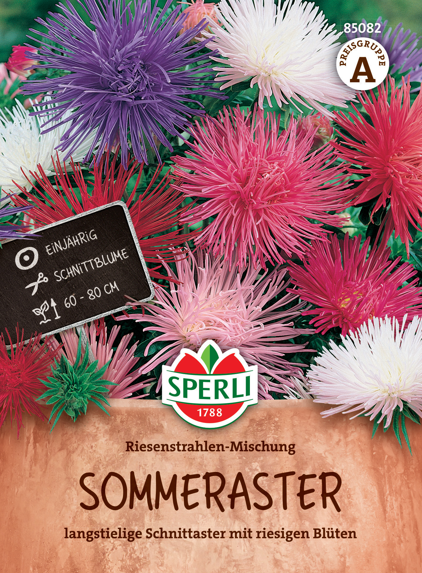 Diese einjährige Astern-Mischung enthält verschiedenfarbige Riesenstrahl-Astern, deren Blütenform einen Durchmesser von bis zu 20 cm erreichen kann. sie sind sehr ergiebig im schnitt, da sich die Pflanzen schon kurz über dem Boden reich verzweigen. ideal für Beete, Einfassungen oder als Schnittblumen. Für Asternkulturen ist es wichtig, dass jedes Jahr der Standort gewechselt wird, so bleiben die Pflanzen gesund.| Kurzbezeichnung : | Sommeraster Riesenstrahlen-Mischung |