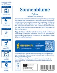 Die Sonnenblume 'Picknic' überzeugt mit vielen kräftigen Blüten und ist perfekt für alle, die eine große Ernte nahrhafter Kerne anstreben. Diese eindrucksvolle Pflanze erreicht bis zu 300 cm Höhe und ist somit nicht nur ein Blickfang, sondern auch eine wertvolle Nahrungsquelle für Bienen und Insekten. Der verzweigte Wuchs bietet zudem die Möglichkeit zur Nutzung als Schnittblume. Genießen Sie die Schönheit und den praktischen Nutzen dieser einjährigen Sorte in Ihrem Garten! Sie wird schnell zu einem besonderen Highlight und bringt zusätzlich Freude und Ertrag auf Ihren Tisch. Säen Sie Freude mit der 'Picknic'!| Kurzbezeichnung : | Sonnenblume Picknic |