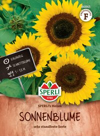 SPERLI's Helios ist eine halbhohe, standfeste Sonnenblume mit besonders harmonischem Blütenaufbau. Ideal in Einzelstellung oder in Gruppen an Zäunen, vor Mauern und als Hintergrundpflanzen in Beeten. Die Sorte eignet sich auch für Pflanzgefäße z. B. auf Terrassen oder Balkonen und ist hervorragend zum Schnitt in den Herbst- und Wintermonaten als Vorrat zur Vogelfütterung. Wenn die Kerne geerntet werden sollen, ist es ratsam, die Blüten vor der Samenreife mit Netzen gegen Vogelfraß zu schützen.| Kurzbezeichnung : | Sonnenblume SPERLI's Helios |