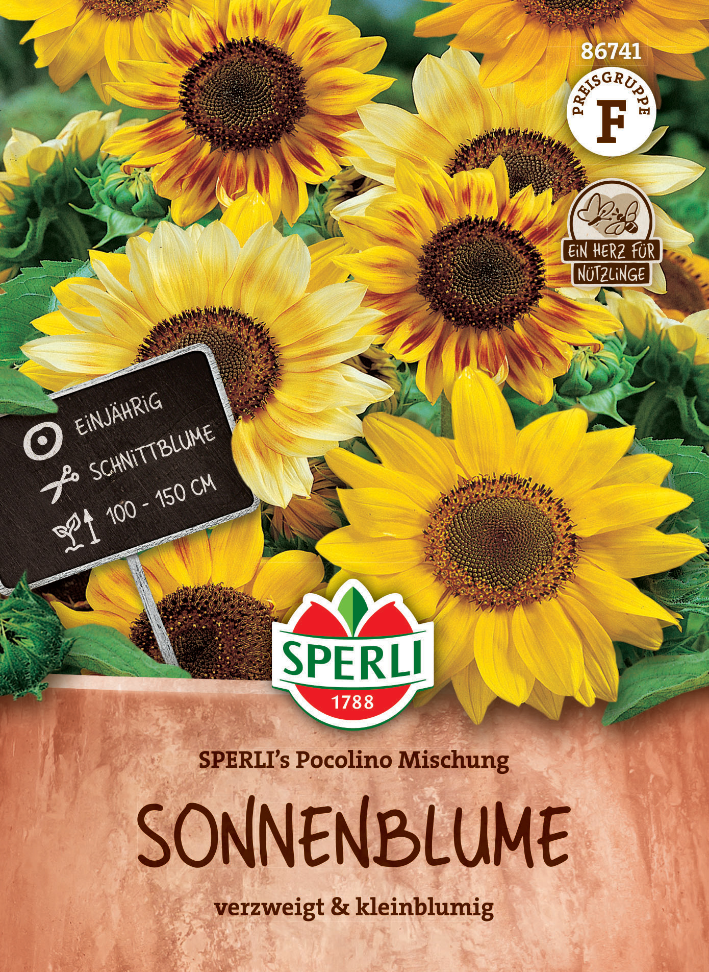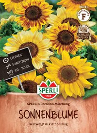 Diese kleinblumige, halbhohe Sonnenblume ist mehrstielig, hat verschiedene Blütenfarben und ist zum Schnitt gut geeignet. Durch die Höhe ist diese Sorte besonders als Hintergrundpflanze zu nutzen. Die Blütezeit dauert von August - Oktober.| Kurzbezeichnung : | Sonnenblume SPERLI's Pocolino Mischung |