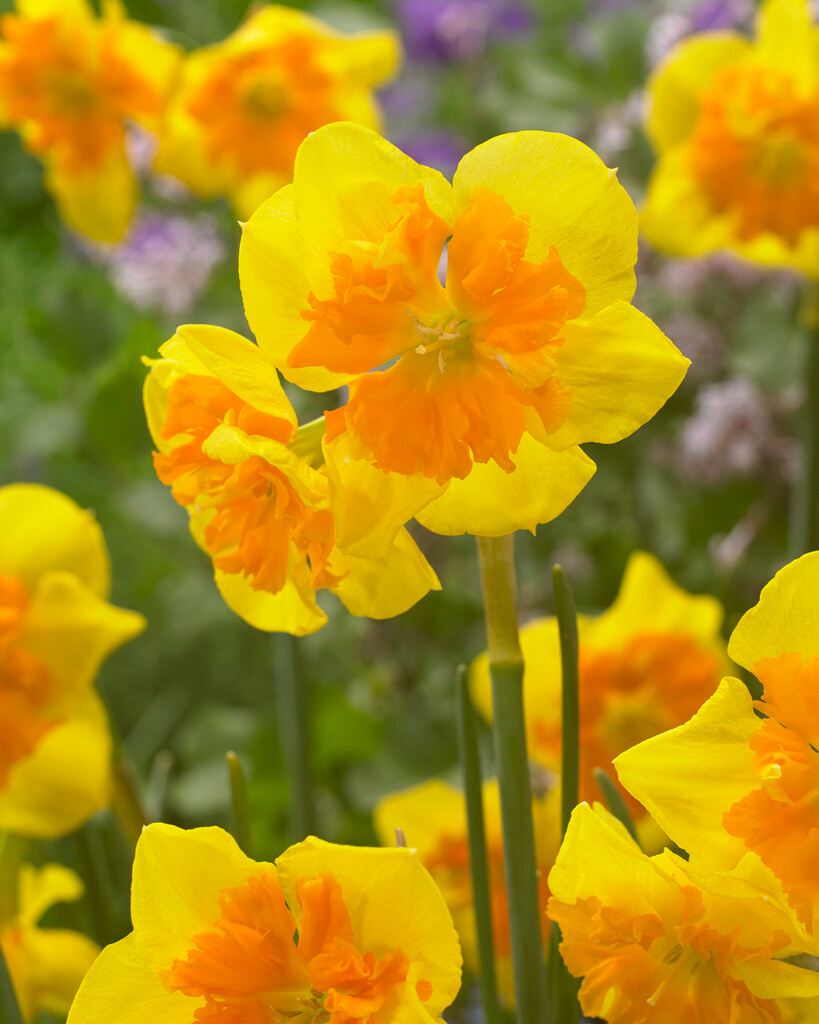 Zitronengelbe Tepalen, rundlich breit; Krone orange, flach, gekräuselt bis gerüscht; mehrblütig| Kurzbezeichnung : | Spleißkronige Narzissen Slice of Life |