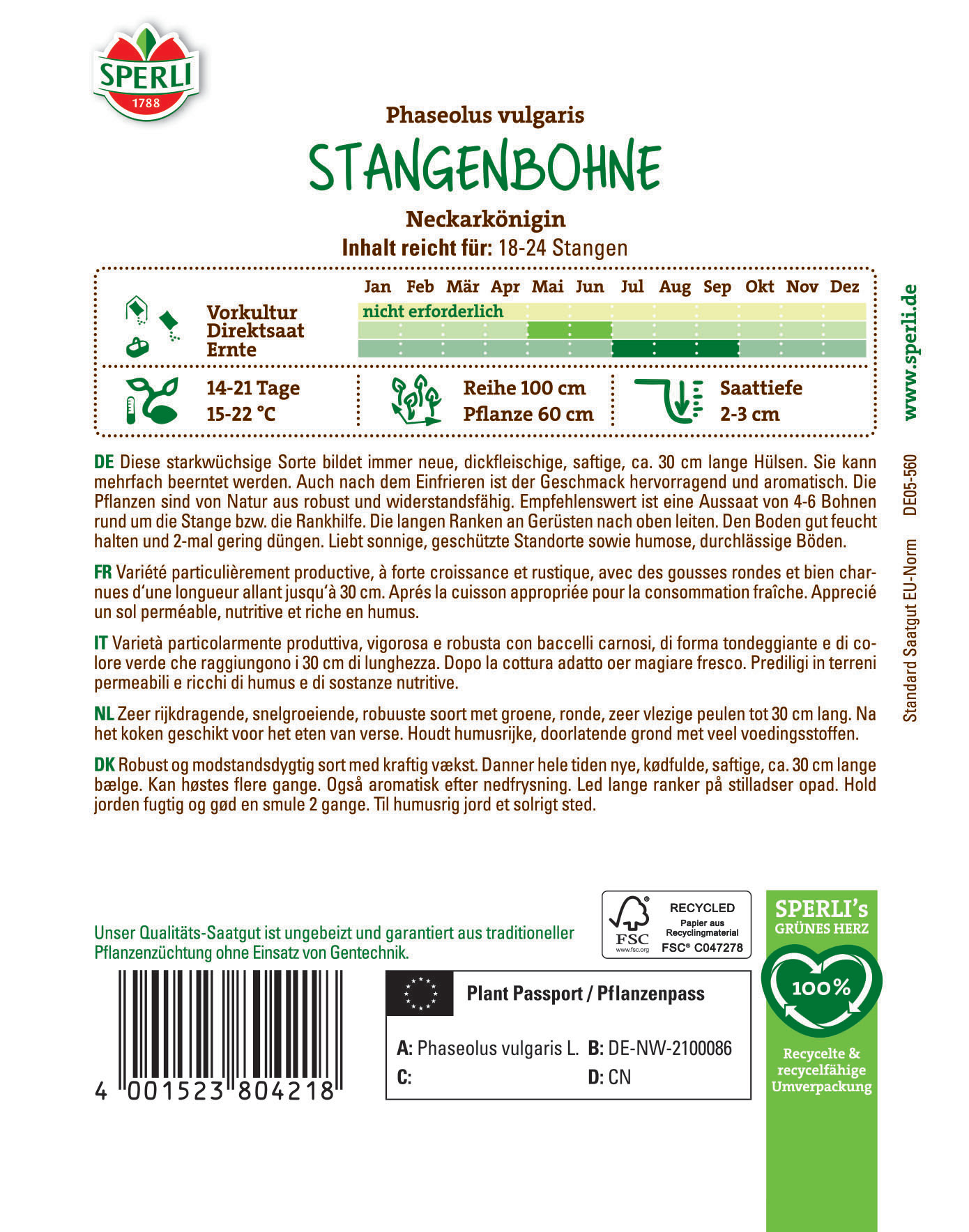 Die grüne Stangenbohne 'Neckarkönigin' hat wunderbar dickfleischige und erfrischend-saftige Bohnen. Sie erreichen eine beeindruckende Länge von 28 cm. Am besten säst Du 'Neckarkönigin' an einem sonnigen, windgeschützten Standort mit humusreichem, lockerem Boden aus. Die Aussaat erfolgt von Mai bis Juni.