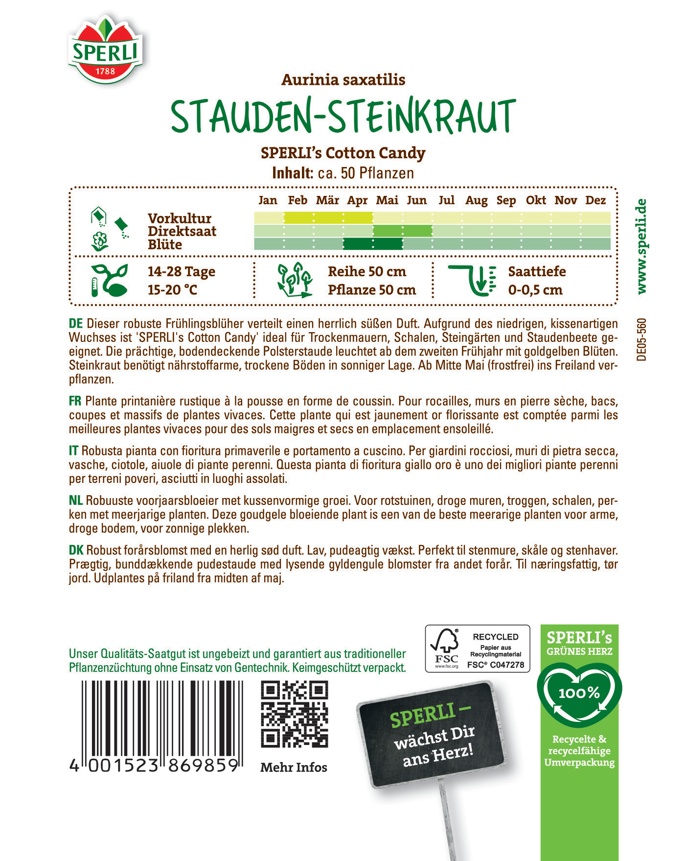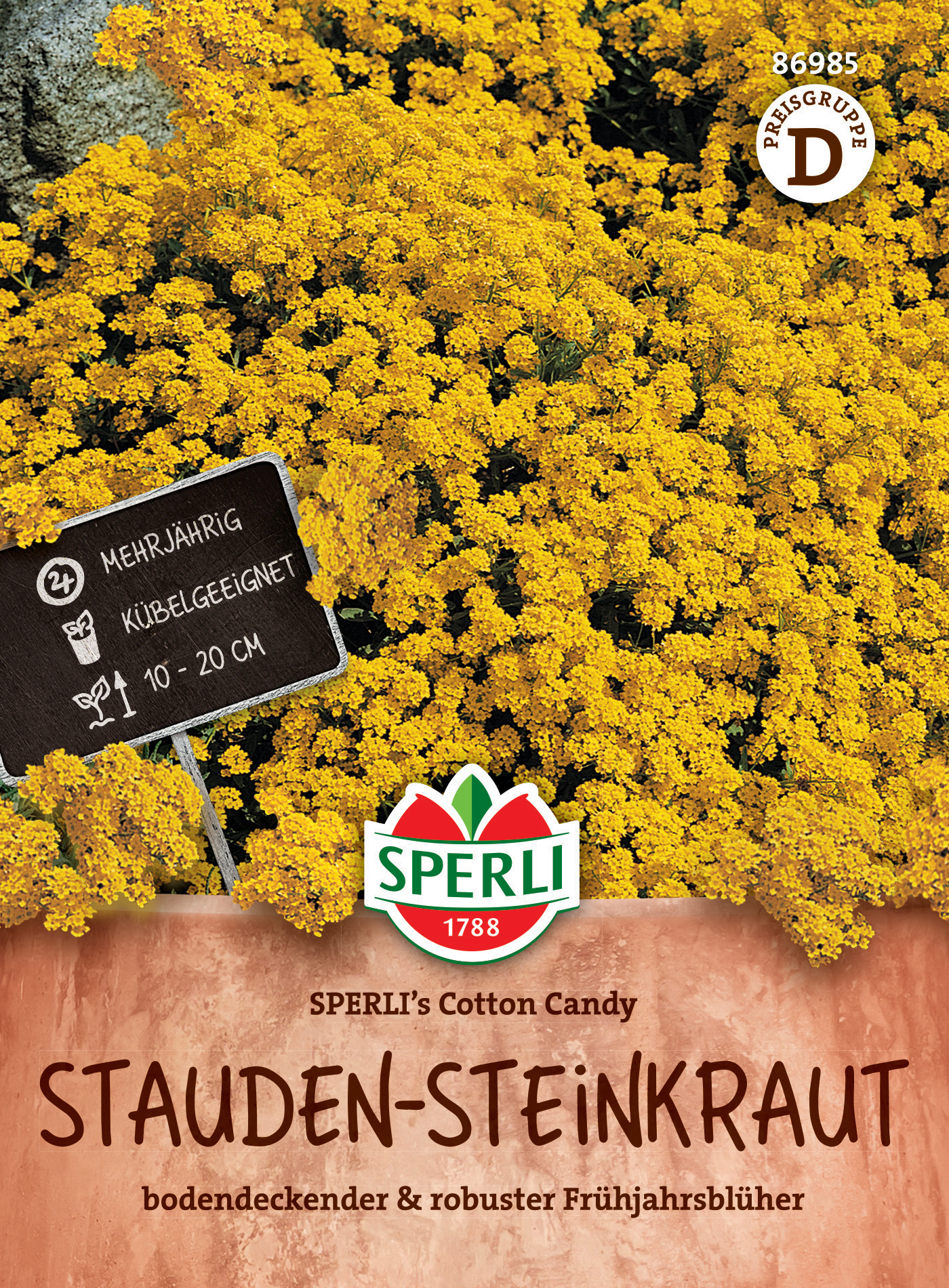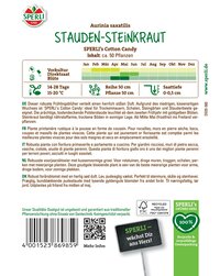 SPERLI's Cotton Candy ist ein mehrjähriger, auch in Mitteleuropa frostharter, sehr einfach anzuziehender Frühjahrsblüher. Bestens geeignet für die Bepflanzung von Steingärten, Mauern, Böschungen oder sonnigen Rabatten. Das Steinkraut bildet dicht schließende kleine Büsche und unterdrückt dadurch zuverlässig Unkräuter. Eine sehr trockenheitsresistente Staude.| Kurzbezeichnung : | Stauden-Steinkraut SPERLI's Cotton Candy |