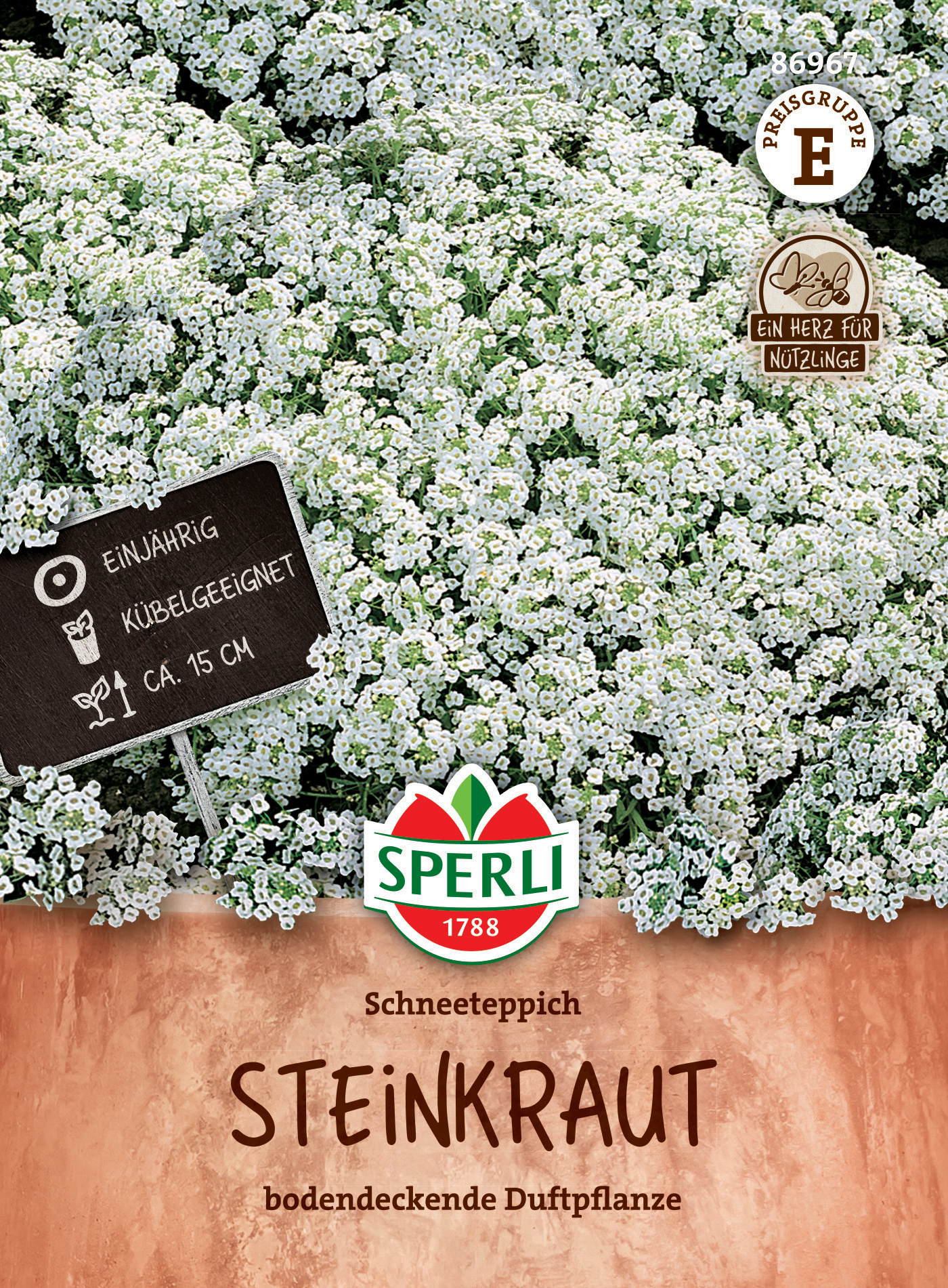 Beliebte Polsterpflanze. Bei voller Sonne ist das Steinkraut ab Juni über und über mit Blüten besetzt und strömt einen angenehmen Duft aus. Wenn die Blüte an Fülle verliert, schneidet man die Pflanzen auf die Hälfte zurück, sie treibt neu aus und blüht zum zweiten Mal bis Ende Oktober. Eine leichte Nachdüngung zwischendurch vergrößert die Blütenpracht. Pflege: Die Pflanzen der Topfaussaat schon bald pikieren und Anfang Mai auspflanzen. Beim Pflanzen mehrere Pflänzchen zusammensetzen (Tuff, Büschel).| Kurzbezeichnung : | Steinkraut Schneeteppich |