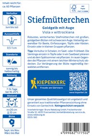 Das robuste und winterharte Stiefmütterchen verzaubert mit seinen großen, goldgelben Blüten und dem markanten schwarzen Auge! Diese vielseitig einsetzbare Pflanze bringt Farbe und Leben in Ihre Beete, Einfassungen, Töpfe oder Kästen. Mit einer Höhe von 10 bis 20 cm setzt sie an jedem Standort glanzvolle Akzente. Die üppige Blütenfülle und die lebendige Ausstrahlung des Stiefmütterchens versprechen sowohl einen Blickfang im Garten als auch den perfekten Begleiter für fröhliche Frühlingsarrangements. Ob einzeln oder in kleinen Gruppen gepflanzt, erfreut das Stiefmütterchen das Auge und bringt Fröhlichkeit in jeden Garten. Genießen Sie die lebhaften Farben und die fröhliche Stimmung, die diese charmante Pflanze verbreitet! Erleben Sie die Freude am Frühling mit dem bezaubernden Stiefmütterchen!| Kurzbezeichnung : | Stiefmütterchen Goldgelb mit Auge |