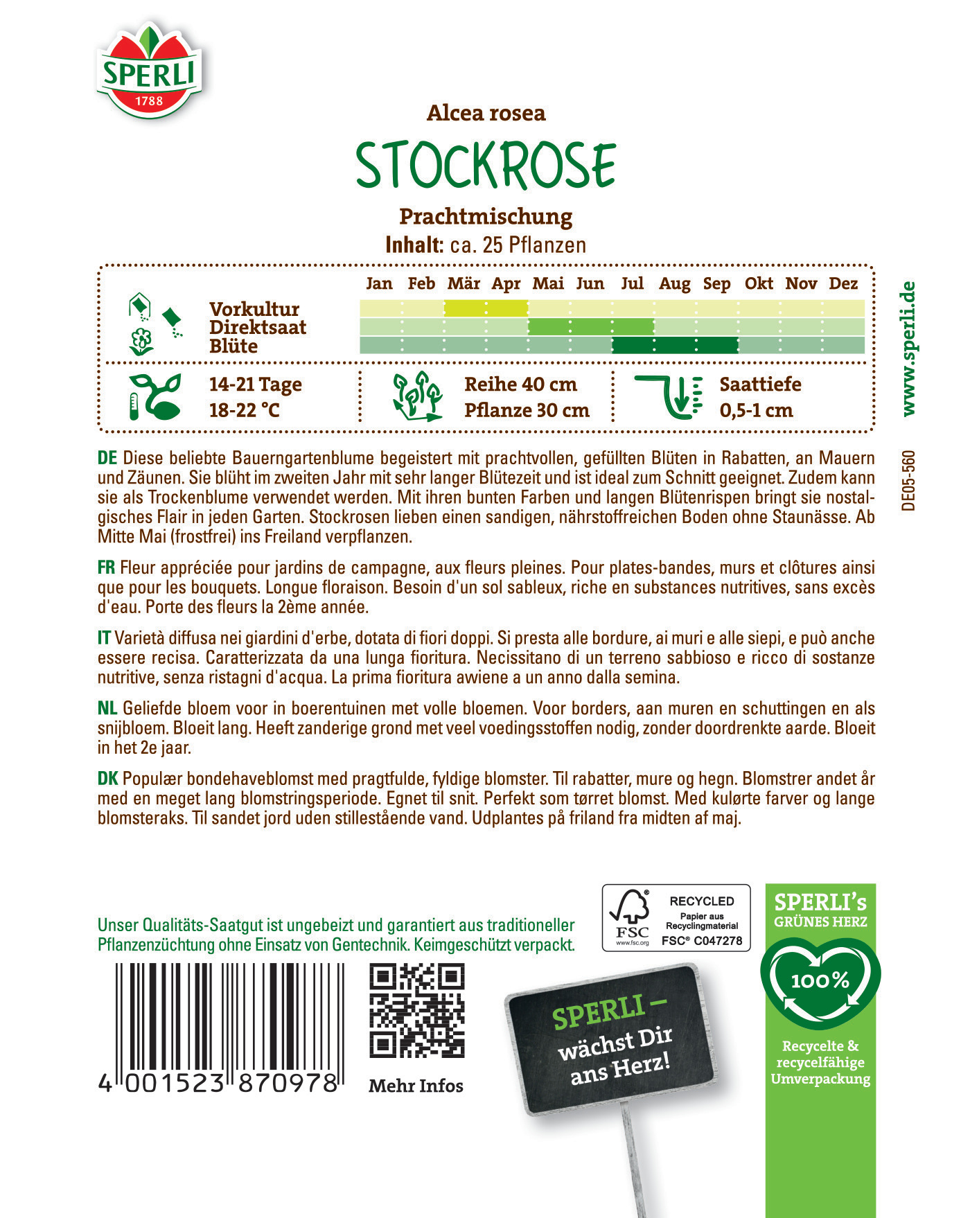 Die Prachtmischung enthält Stockrosen in vielen verschiedenen Weiß-, Gelb-, Rosa- und Rottönen. Ideal als Einzel- oder Gruppenstauden für Bauerngärten, vor Südwänden, in Blumenbeeten oder vor Zäunen. Höhe: 180 cm.| Kurzbezeichnung : | Stockrose Prachtmischung |