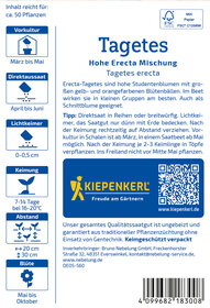 Die Erecta-Tagetes sind hohe Studentenblumen mit großen, leuchtend gelb- und orangefarbenen Blütenbällen, die ein strahlendes Bild in Ihren Garten zaubern! Diese einjährigen Schönheiten erreichen eine Höhe von 60 bis 80 cm und kommen im Beet in kleinen Gruppen besonders gut zur Geltung. Ihre farbenfrohe Präsenz bringt Frische und Lebensfreude in jeden Garten. Schaffen Sie mit diesen prachtvollen Pflanzen ein harmonisches Ensemble aus Farben und Formen! Lassen Sie sich von der leuchtenden Schönheit der Erecta-Tagetes inspirieren und genießen Sie die Freude, die diese fröhlichen Blumen in Ihren Außenbereich bringen! Bereichern Sie Ihren Garten mit der Erecta-Tagetes für farbenfrohe Gartenfreuden!| Kurzbezeichnung : | Tagetes Hohe Erecta Mischung |