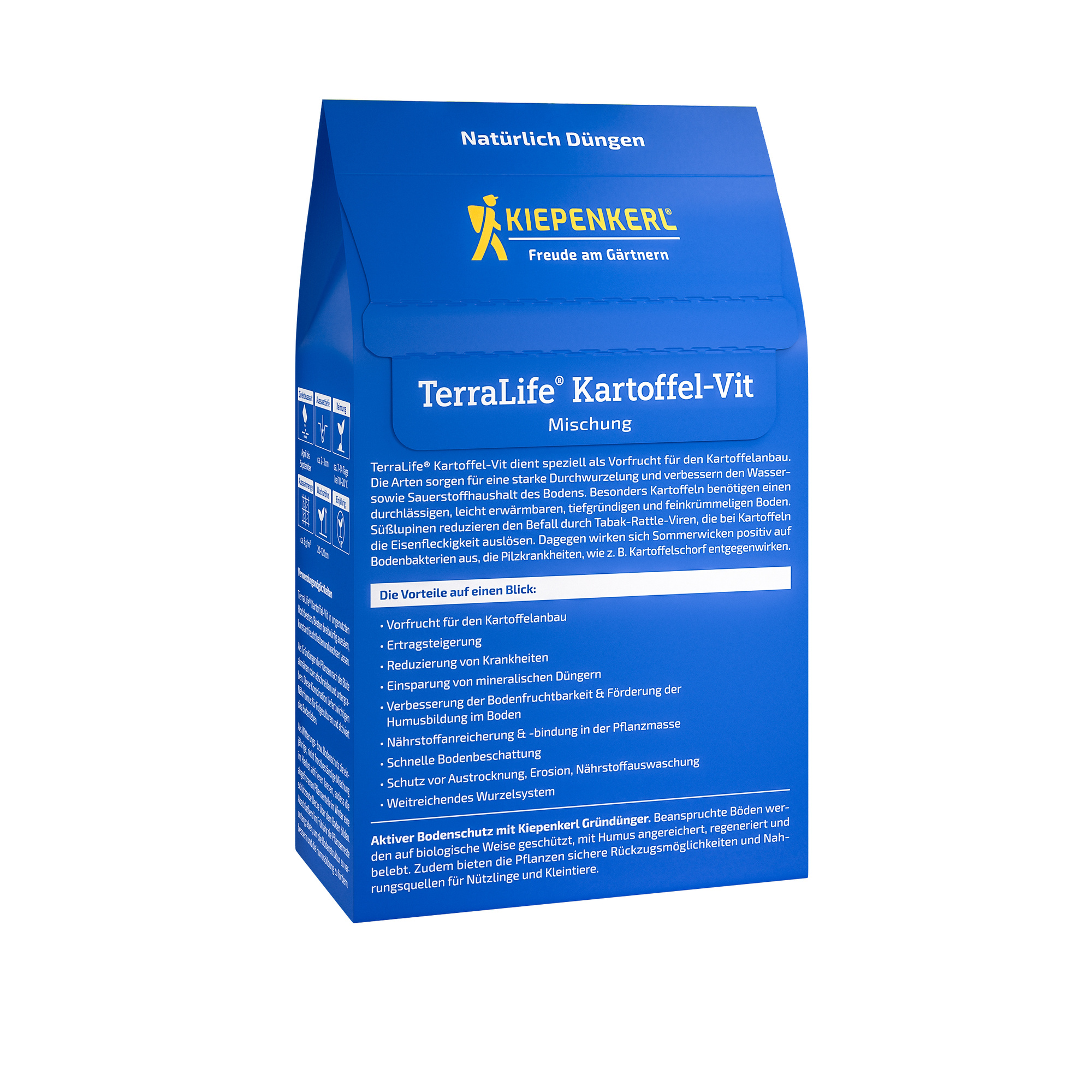 TerraLife® Kartoffel-Vit ist speziell entwickelt, um als Vorfrucht für den Kartoffelanbau optimale Bedingungen zu schaffen. Diese ausgewogene Mischung fördert eine starke Durchwurzelung und verbessert sowohl den Wasser- als auch den Sauerstoffhaushalt des Bodens. Kartoffeln gedeihen besonders gut in einem durchlässigen, leicht erwärmbaren und tiefgründigen Boden mit feiner Krümelstruktur. Die enthaltenen Süßlupinen reduzieren den Befall mit Tabak-Rattle-Viren, die bei Kartoffeln Eisenfleckigkeit hervorrufen können. Gleichzeitig fördern Sommerwicken das Wachstum von Bodenbakterien, die Pilzkrankheiten wie Kartoffelschorf entgegenwirken.