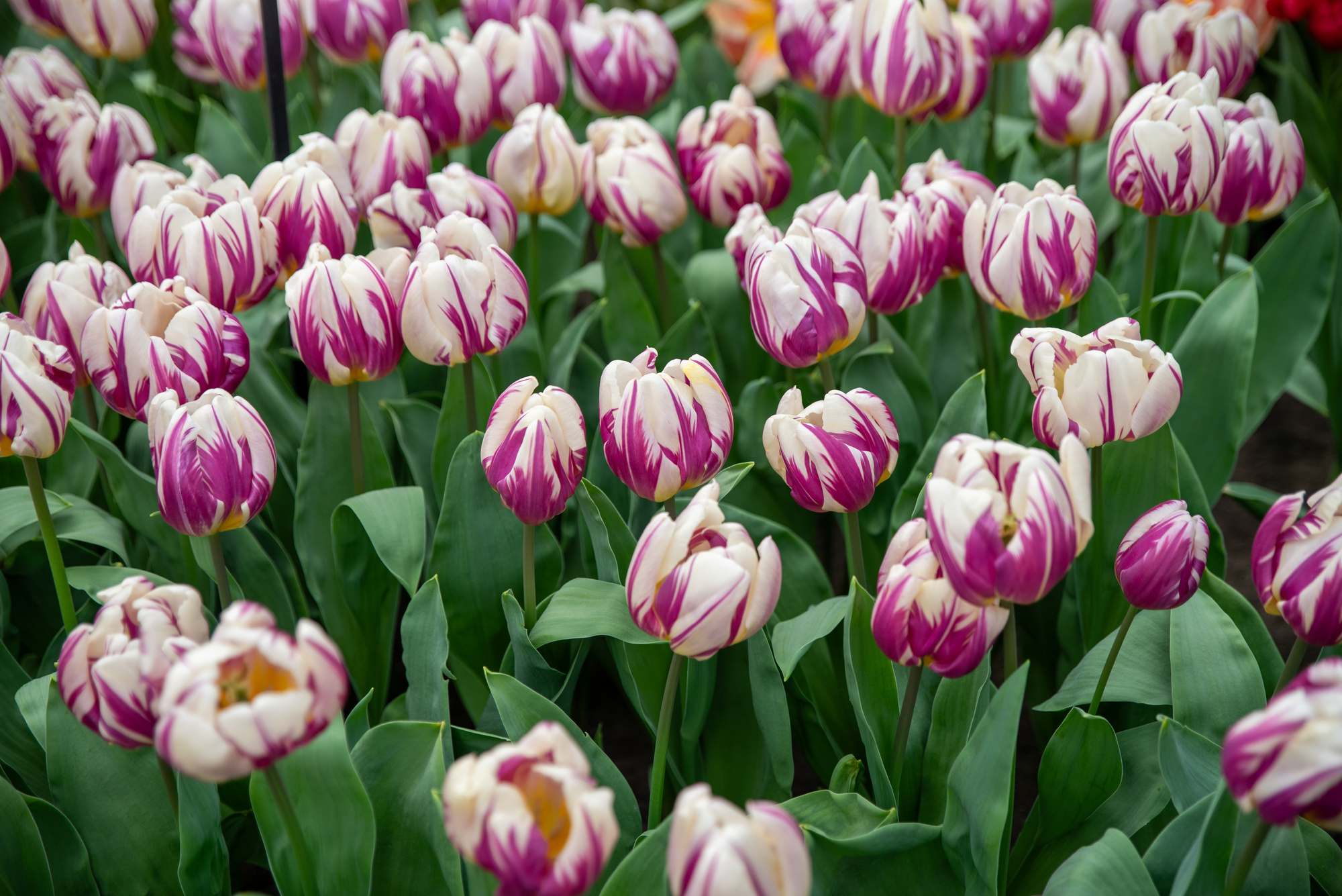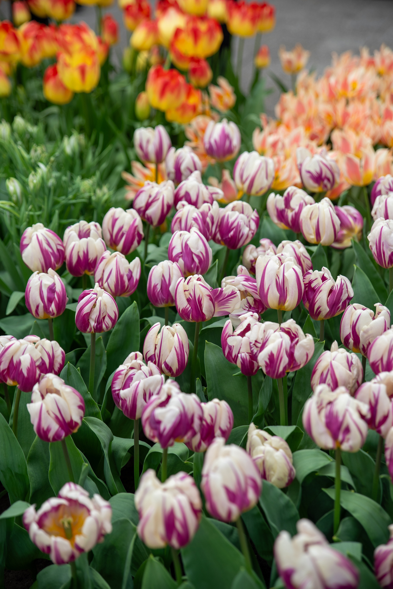 Farbbeschreibung: Weiß, violett geflammt| Kurzbezeichnung : | Triumph-Tulpen Happy Feet |