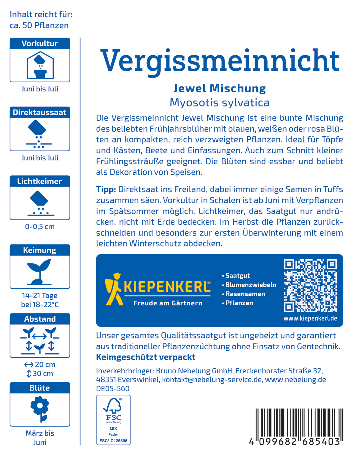 Die Vergissmeinnicht Jewel Mischung bringt eine harmonische Farbenvielfalt in jeden Garten. Diese beliebten Frühjahrsblüher präsentieren sich in Blau, Weiß und Rosa und sind ideal für Töpfe sowie Kästen. Ihre kompakte Wuchsform macht sie zur perfekten Wahl für frische Blumensträuße und als Zierpflanze. Mit dieser Mischung verwandeln Sie Ihre Außenräume in ein blühendes Paradies. Außerdem ziehen die sanft duftenden Blüten nützliche Bestäuber an und tragen so zur Biodiversität Ihres Gartens bei. Lassen Sie sich von der Schönheit dieser charmanten Mischung verführen und genießen Sie die Farbenpracht von Vergissmeinnicht in voller Blüte. Bringen Sie mit der Vergissmeinnicht Jewel Mischung Farbe und Leben in Ihren Garten!| Kurzbezeichnung : | Vergissmeinnicht Jewel Mischung |
