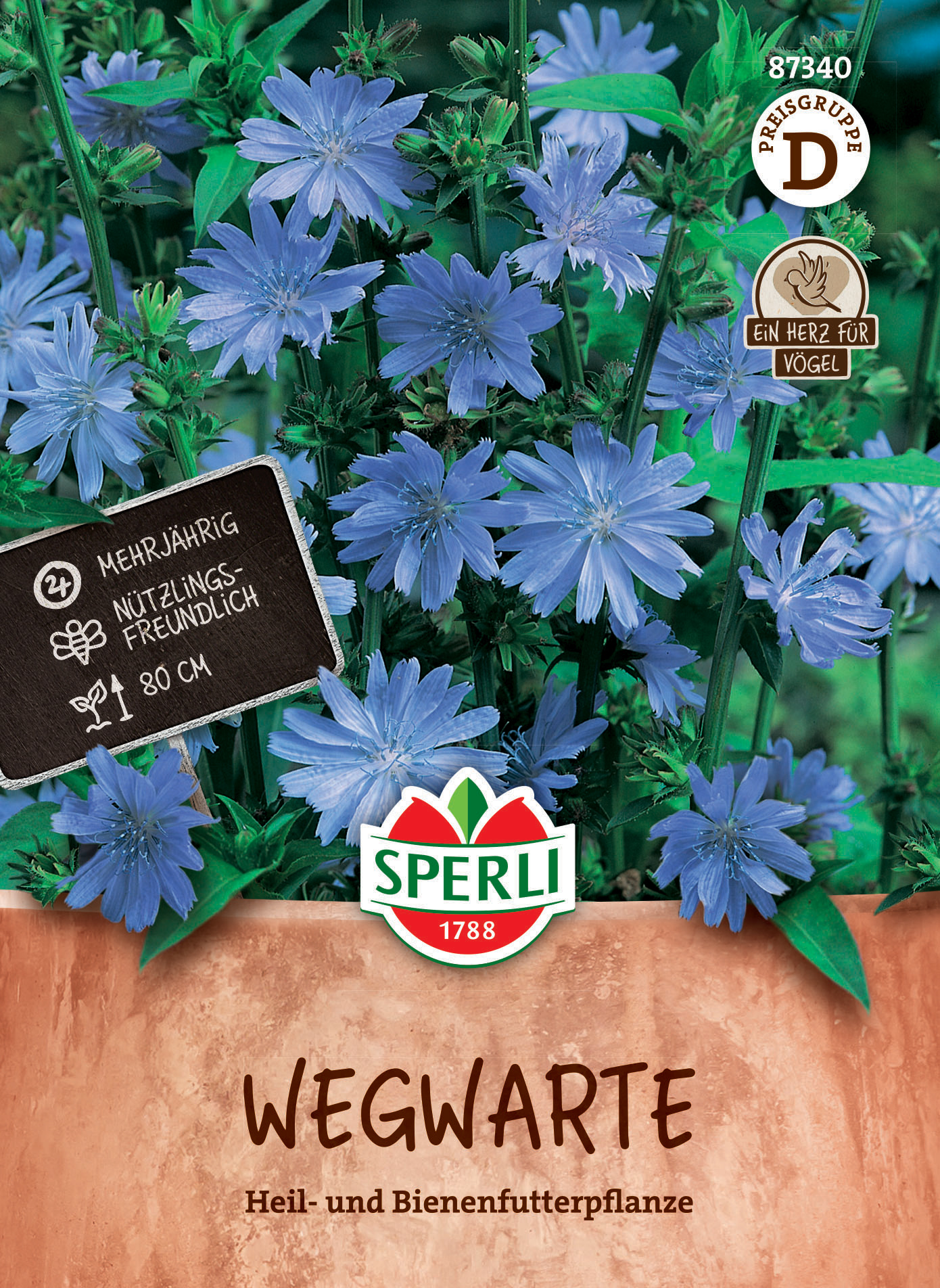 Die Wegwarte ist eine mehrjährige Staude. Sie gehört zu den Heil- und Bienenfutterpflanzen. Zudem zählt sie zu den Staudensorten, die besonders nützlingsfreundlich ist. Gerne kann sie als Küchenkraut verwendet werden. Die Wegwarte wird bis zu 80 cm hoch. Ihre Blüten leuchten in einem schönen Hellblau bis Violett. Die Blätter der Staude sind mattgrün und fliederspaltig geformt.