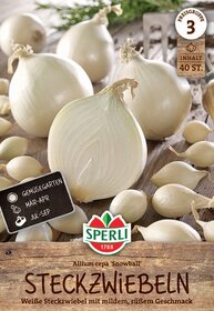 Die weiße Steckzwiebel 'Snowball' ist eine Zwiebelsorte, die bestens für alle geeignet ist, die Zwiebeln mit zu scharfem und intensivem Geschmack weniger gerne mögen. Im Frühjahr gepflanzt, kannst Du Dich bei dieser Sorte ab Juli über Zwiebeln mit mildem, süßem Geschmack freuen. Die Zwiebel mit weißer Schale ist ideal für den frischen Verzehr geeignet, so dass sie etwa eine aromatische Zutat von Salaten darstellt.
