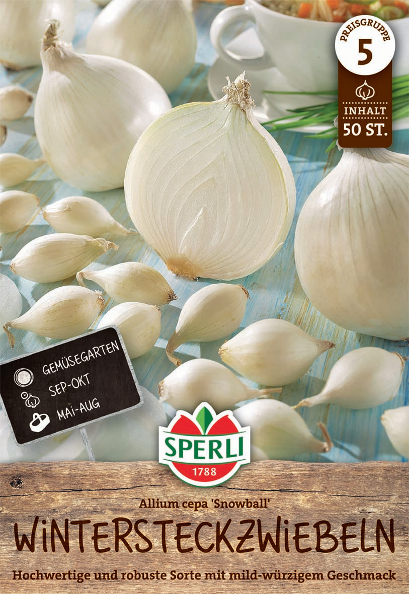 Die weiße Steckzwiebel 'Snowball' ist eine Zwiebelsorte, die bestens für alle geeignet ist, die Zwiebeln mit zu scharfem und intensivem Geschmack weniger gerne mögen. `Snowball' ist eine hochwertige und robuste Sorte mit einem mild-würzigen Geschmack. Die Zwiebel mit weißer Schale ist ideal für den frischen Verzehr geeignet, so dass sie etwa eine aromatische Zutat von Salaten darstellt. Sie besitzt eine sehr gute Winterhärte und bildet gleichmäßig runde Zwiebeln.