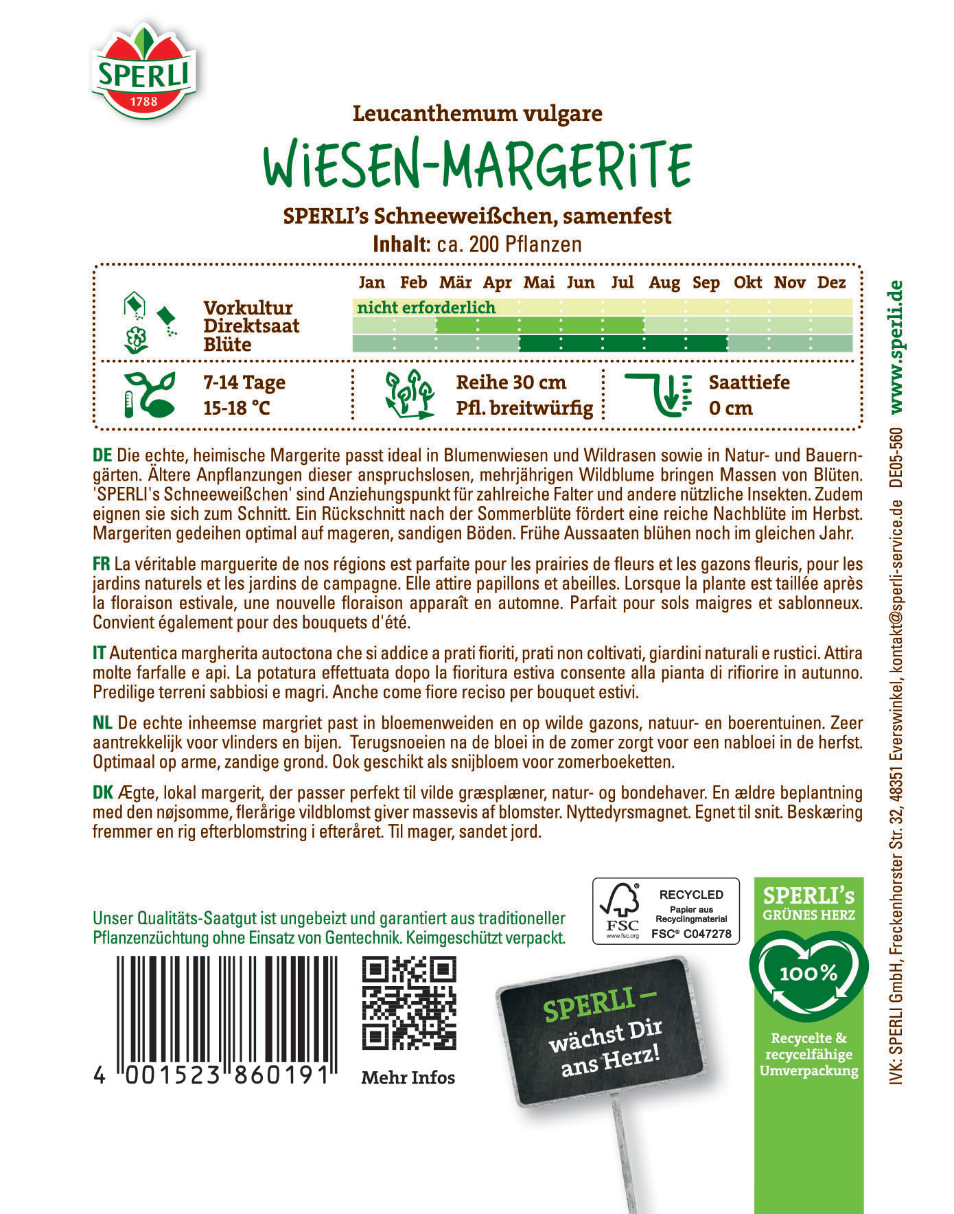 SPERLI's Schneeweißchen ist eine ideale Pflanze für Blumenwiesen, Wildrasen oder Natur- und Bauerngärten. Eine Staude mit grundständigen, länglich gekerbten Blättern sowie einzeln stehenden, 5 cm großen Blütenköpfen. Ältere Horste können hunderte von weißen Blüten hervorbringen. Die Blüten werden von vielen Insekten angeflogen. SPERLI's Schneeweißchen verträgt das Mähen.| Kurzbezeichnung : | Wiesen-Margerite SPERLI's Schneeweißchen |
