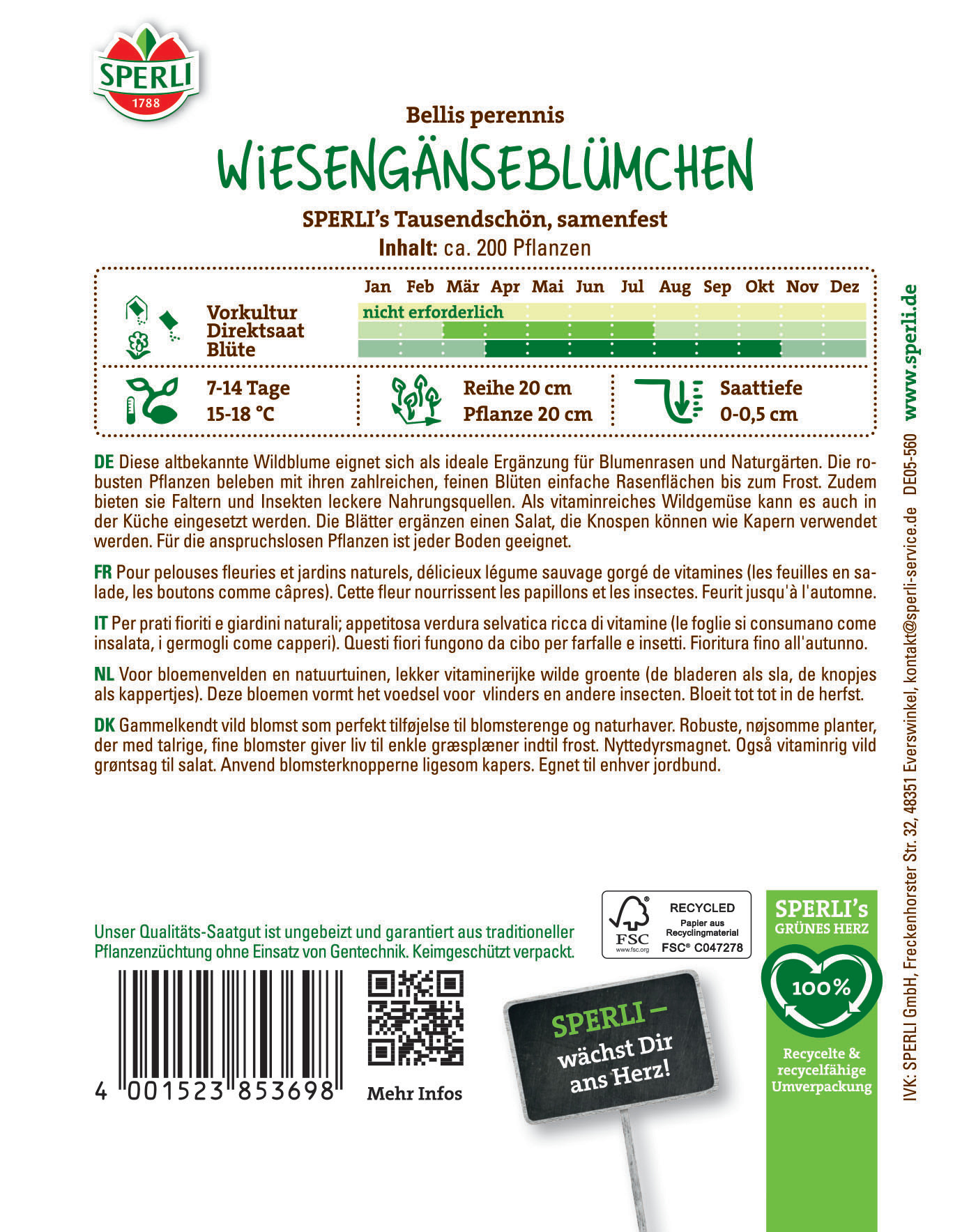Das echte Wiesengänseblümchen eignet sich nicht nur als Wildgemüse (man verwendet die Blätter ganzjährig als Salat, die Knospen in Essig gelegt wie Kapern), sondern belebt mit seinen einfachen, zahlreich und fast ganzjährig erscheinenden Blüten monotone Rasenflächen.| Kurzbezeichnung : | Wiesengänseblümchen SPERLI's Tausendschön |