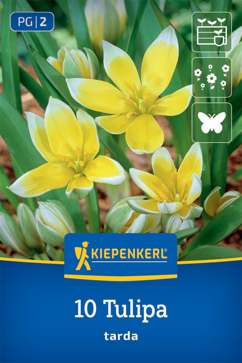 Die Wildtulpe Tulipa tarda hat eine weit geöffnete Blüte, deren Form an einen Stern erinnert. Die Spitzen der Blüten sind weiß, während sie in der Mitte intensiv gelb gefärbt sind. Im April und Mai tragen die 10 cm hohen Blumen zahlreiche Blüten und locken damit Nützlinge an. Gut macht sich die Wildtulpe Tulipa tarda in Steingärten und Gefäßen, aber auch in naturnahen Beeten. Außerdem eignet sie sich zum Verwildern.| Kurzbezeichnung : | Wildtulpe Tulipa tarda |