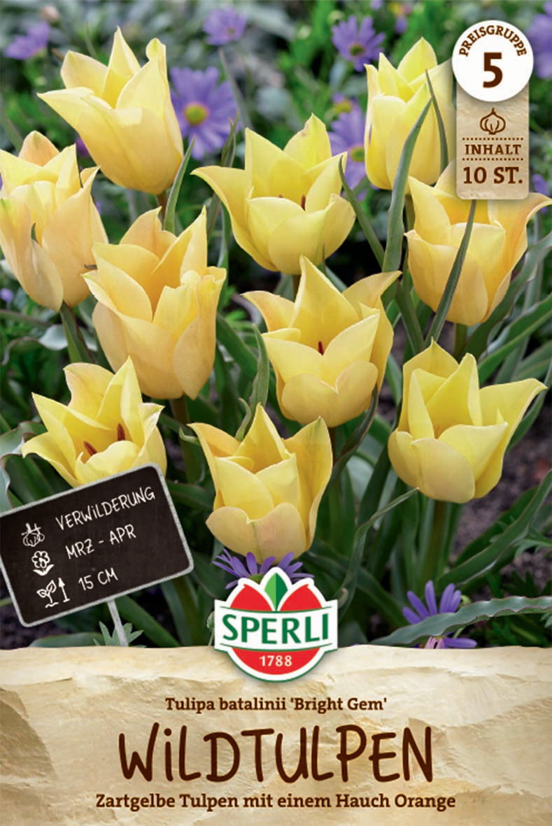 Robust und langlebig ist die Wildtulpe 'Bright Gem' in der Kultur. Ihre gelb-orangefarbenen Blüten, die sich im April und Mai entfalten, sind jedoch das eigentliche Highlight dieser bezaubernden Wildtulpe. Sie sind nicht nur optisch höchst attraktiv, sondern wirken auch auf Insekten ungemein anziehen.