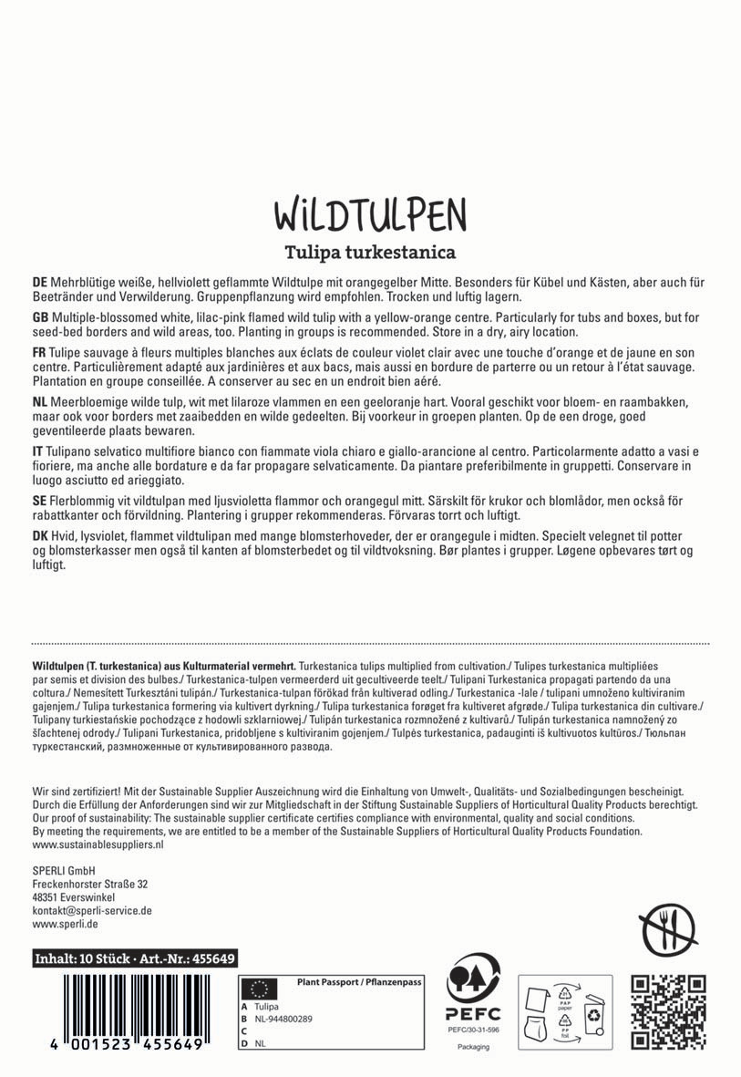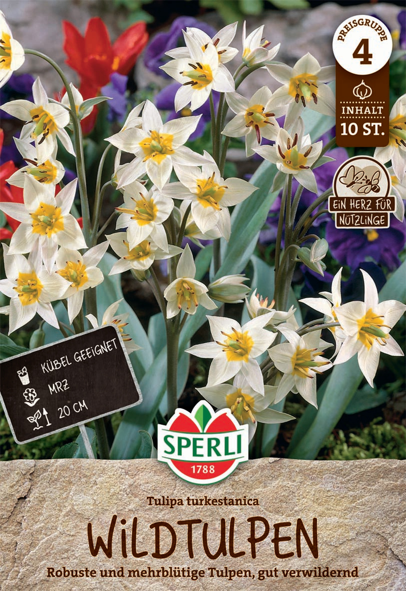 Unsere Wildtulpen turkestanica sind mehrblütige weiße Wildtulpen mit einer auffällig orange-gelben Mitte. Ihre kompakte Größe von ca. 15 cm macht sie zur idealen Wahl für Balkonier, denn auch in Kübeln und Kästen ist der Kulturerfolg garantiert. Natürlich kannst Du ebenso Deine Beetränder mit ihnen schmücken oder die Tulpen im Garten verwildern lassen.