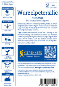 Die Wurzelpetersilie 'Halblange' begeistert mit ihren glatten, 15-20 cm langen Wurzeln, die ein kräftiges Aroma entfalten. Diese vielseitige Sorte ist unverzichtbar als Suppenwürze und verfeinert mühelos Wurzelgemüse sowie Salate. Ihr intensives Aroma bringt eine neue Dimension in Ihre Küche und macht sie zur idealen Zutat, um Gerichte geschmacklich zu bereichern. Nutzen Sie die 'Halblange' Wurzelpetersilie in zahlreichen Rezepten – ob als Hauptzutat in einem herzhaften Eintopf oder als geschmacklicher Ergänzer in frischen Salaten. Ihre robusten Aromen setzen Akzente und sorgen für ein unverwechselbares Geschmackserlebnis. Lassen Sie sich von der Vielseitigkeit der Wurzelpetersilie inspirieren und entdecken Sie, wie einfach es ist, köstliche Gerichte mit dieser speziellen Sorte zuzubereiten! Lassen Sie sich von der 'Halblange' überraschen!| Kurzbezeichnung : | Wurzelpetersilie Halblange |