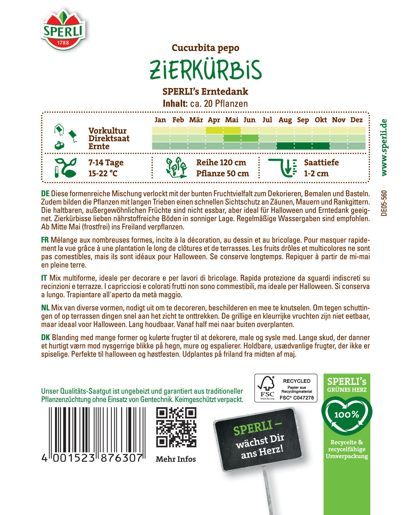 Der Zierkürbis hat bis zum heutigen Tag nichts von seiner rustikalen Attraktivität verloren. Ob Sie nun ein schnellwachsendes Rankgewächs für Zäune, Spaliere, Pergolen etc. suchen oder sich jetzt schon auf die Früchte für die Winterdekoration freuen - diese Spezialmischung ungewöhnlicher Formen und Farben wird Sie begeistern. Pflege: Die Sämlinge aus der Zimmeraussaat ab Mitte Mai an Ort und Stelle in Freiland pflanzen. Zierkürbisse benötigen nahrhaften, humosen Boden und reichlich Wasser. Nachdüngen ist empfehlenswert, warme, sonnige Standorte werden bevorzugt.| Kurzbezeichnung : | Zierkürbis SPERLI's Erntedank |