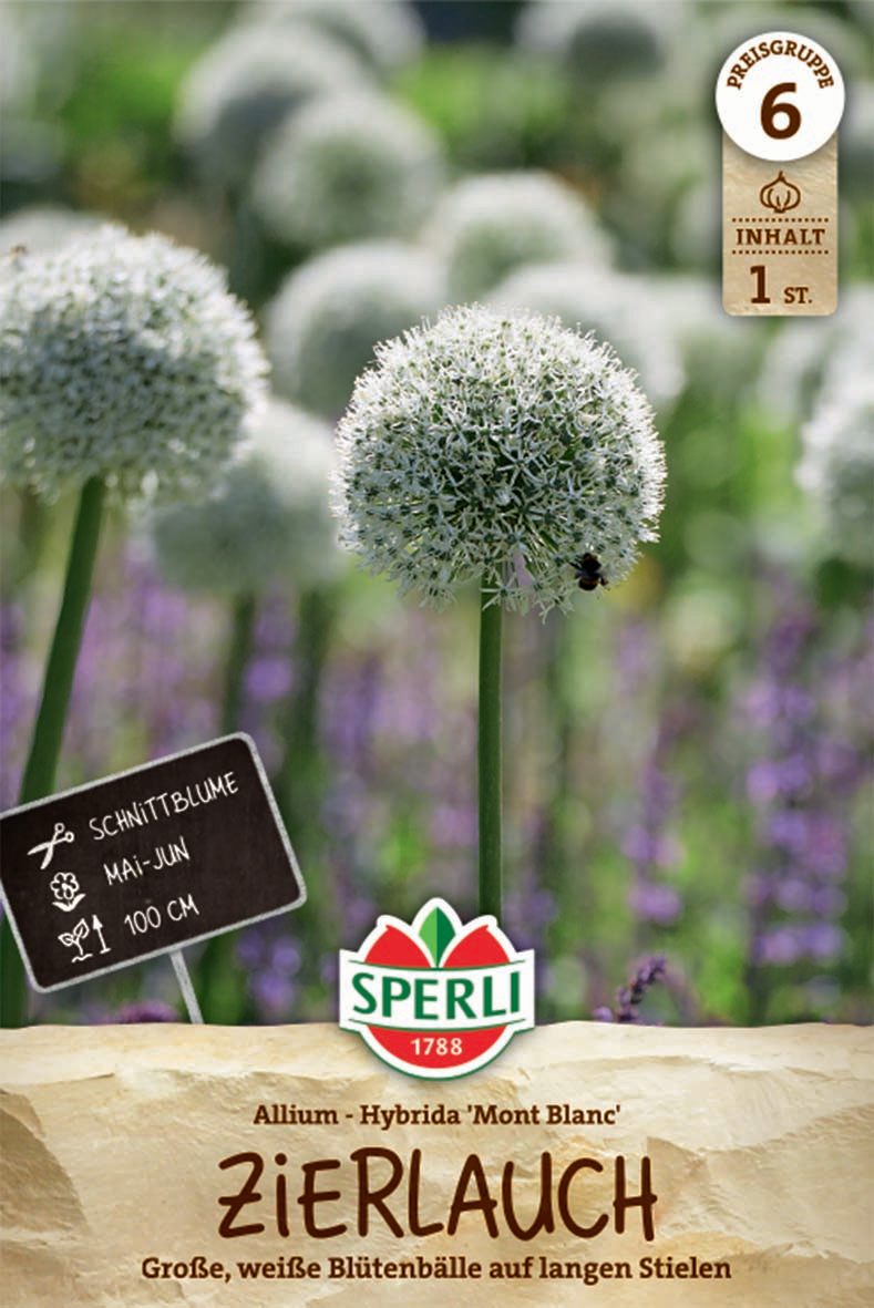 Außerdem ist er auch im Beet ein Highlight, denn er erreicht eine Wuchshöhe von bis zu 1 m. Dort wirkt er besonders gut in Kombination mit Stauden und violettem Zierlauch. Ab Mai blühen die attraktiven Blütenkugeln und bieten zudem Nützlingen wertvolle Nahrung. Der Zierlauch 'Mont Blanc' verwildert auch gut.