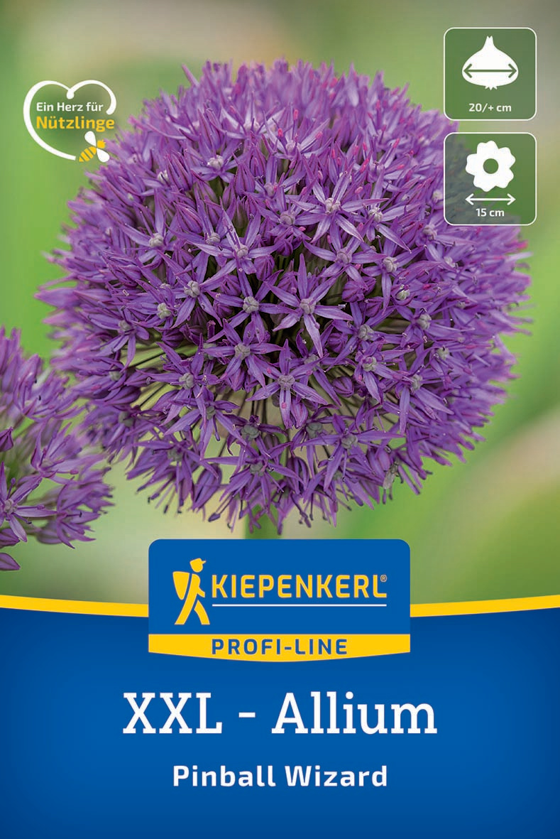 Der Zierlauch `Pinball Wizard` von Kiepenkerl gehört zu den eindrucksvollsten Riesen-Zierlauchen im Garten. Die XXL-Blumenzwiebel sorgt für kräftiges Wachstum und besonders große Blütenkugeln in intensivem Lila. Jede Kugel besteht aus vielen sternförmigen Einzelblüten, die einen Durchmesser von bis zu 15 Zentimetern erreichen und Bienen und anderen Insekten wertvolle Nahrung bieten. Mit einer Wuchshöhe von etwa 80 Zentimetern schwebt Pinball Wizard eindrucksvoll über Staudenbeeten und Etagenpflanzungen.