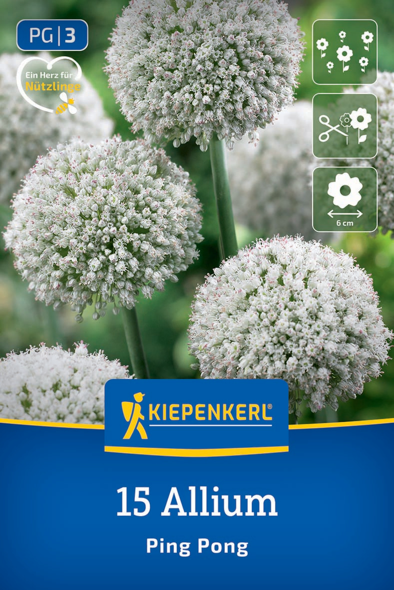Die dich besetzten weißen Blütenbälle des Zierlauchs 'Ping Pong' sind an sich schon eine faszinierende Erscheinung. Dass sie zudem auf ca. 100 cm hohen Stängeln thronen, lässt sie noch eindrucksvoller erscheinen. Die Blütenbälle setzen sich aus vielen kleinen Einzelblüten zusammen, welche Insekten auf Nahrungssuche in Scharen anlocken. In Staudenbeeten, die sonnig oder halbschattig gelegen sind, fühlt sich 'Ping Pong' am wohlsten. Er eignet sich ausgezeichnet für die Verwilderung und auch als kreative Schnittblume.