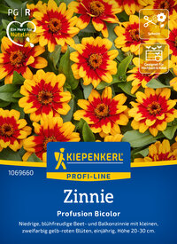Die Zinnie 'Profusion Red Yellow Bicolor' zieht mit ihren goldgelben Blüten und rotem Ring alle Blicke auf sich. Diese robusten Pflanzen sind ideal für Töpfe und Beete, blühen üppig und sind außergewöhnlich pflegeleicht. Sie sorgen für fröhliche Akzente in Ihrem Garten. Essbar und robust, bereichert diese Zinnie Ihre Gartengestaltung und sorgt für lebendige Farben bis zum Frost. Lassen Sie sich von der Vielfältigkeit dieser Pflanzen inspirieren und schaffen Sie ein florales Paradies für sich selbst! Bringen Sie mit der Zinnie 'Profusion Red Yellow Bicolor' Farbe in Ihren Garten!| Kurzbezeichnung : | Zinnie Profusion Bicolor |