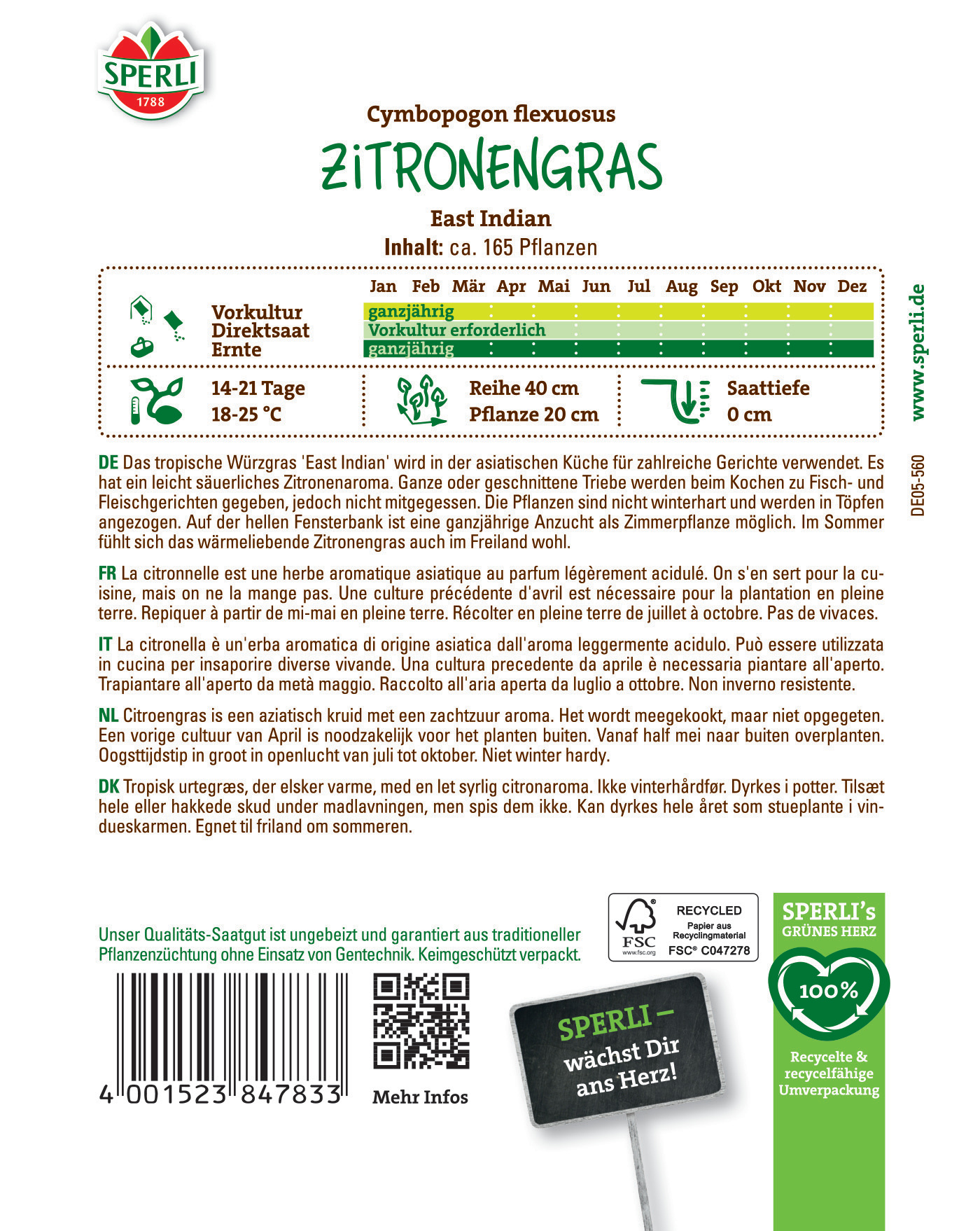 Wenn Du unkonventionell Deine Fisch- und Fleischgerichte verfeinern möchtest, ist das Zitronengras 'East Indian' von SPERLI genau das Richtige für Dich! Es hat einen zitronenartigen und etwas säuerlichen Geschmack und wird vor allem in der asiatischen Küche im Ganzen oder geschnitten zum Würzen verwendet. Doch Achtung: Mitgegessen wird es nicht!