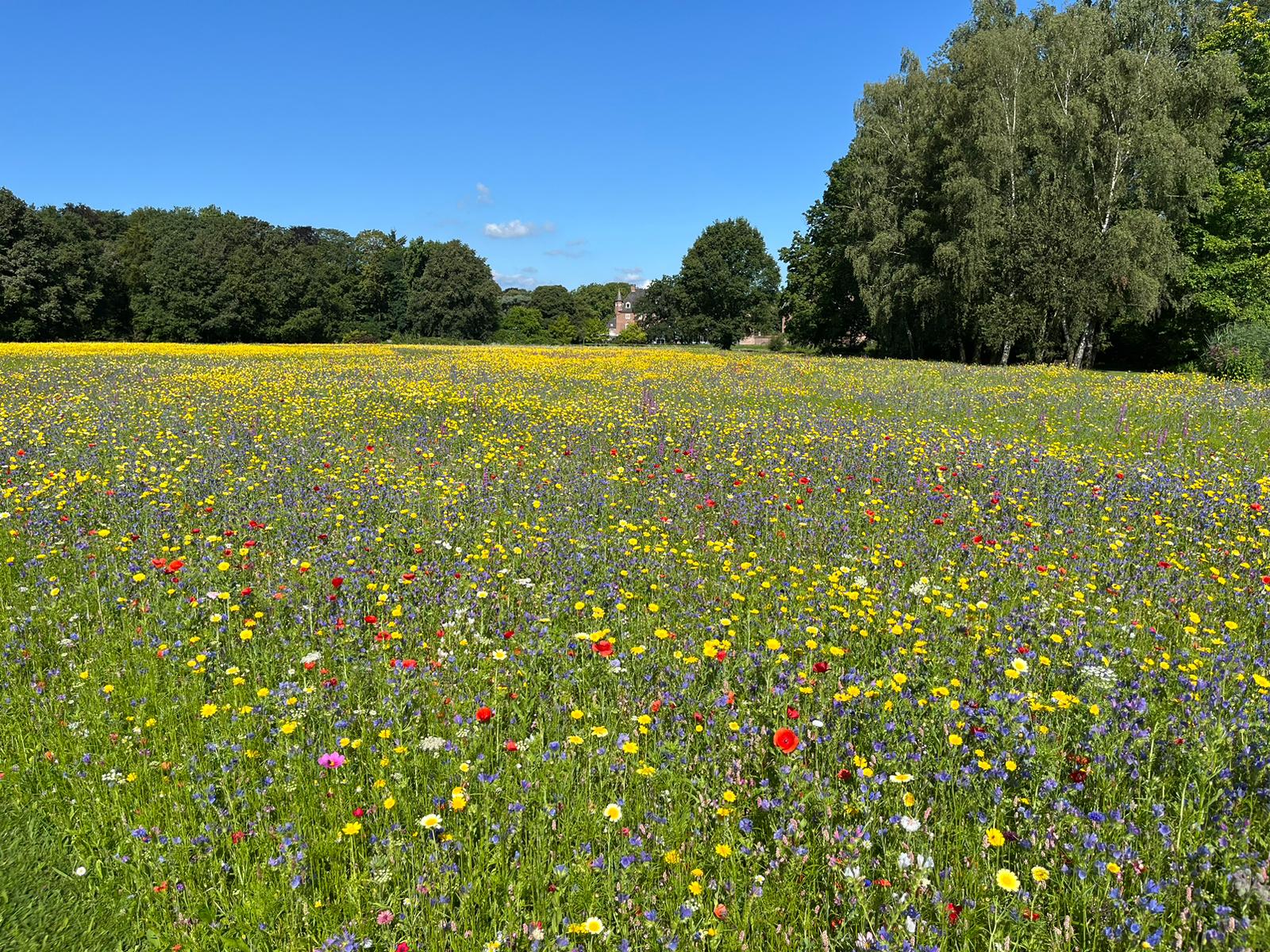 Seit einigen Wochen blühen unsere Kiepenkerl-Mischungen `Ländliche Blütewelle` und `Wildblumenmischung` auf über 1 Hektar Fläche im Landschaftspark der Wasserburg Anholt.